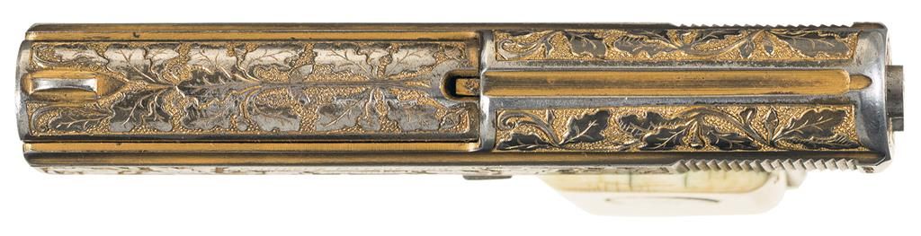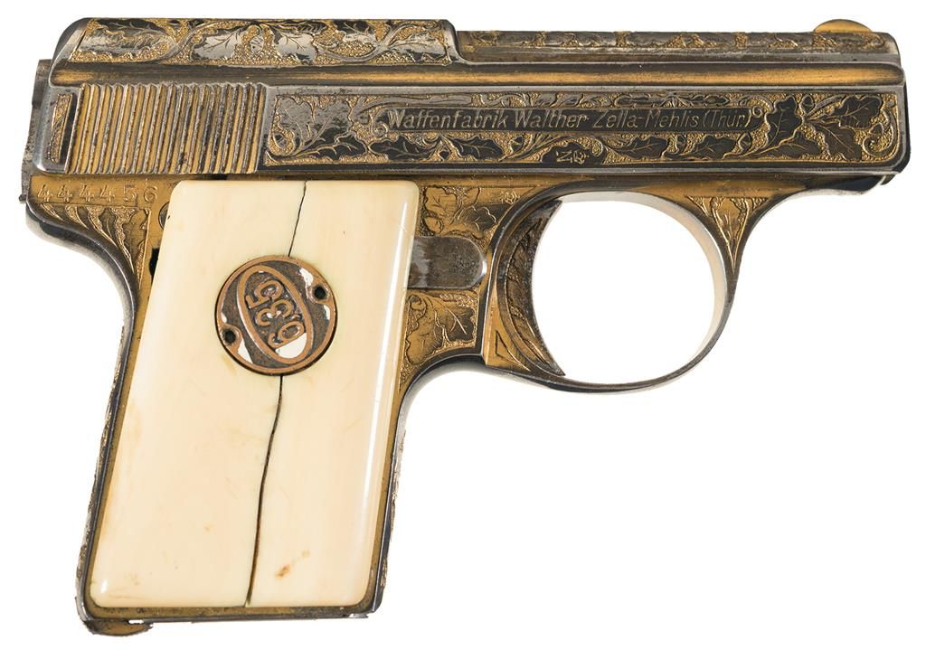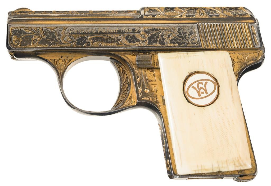 Manufactured from 1921 to 1944 with this special order gold plated example having a factory relief engraving. The full deluxe engraving covers nearly all of the metal surfaces. The engraving is an oak leaf and punch dot pattern and the engraving surrounds the slide markings. The left side of the slide is marked "Walther's Patent Mod. 9" above the Walther banner and the right has the Walther address marking. Commercial "Crown/N" proofs are stamped on the right side of the slide and frame. The rear of the slide has an indicator pin. The pistol is fitted with a set of smooth ivory grips featuring the intertwined logo on the left panel and "6.35" on the right panel. The magazine is gold plated and has the Walther banner on the base.