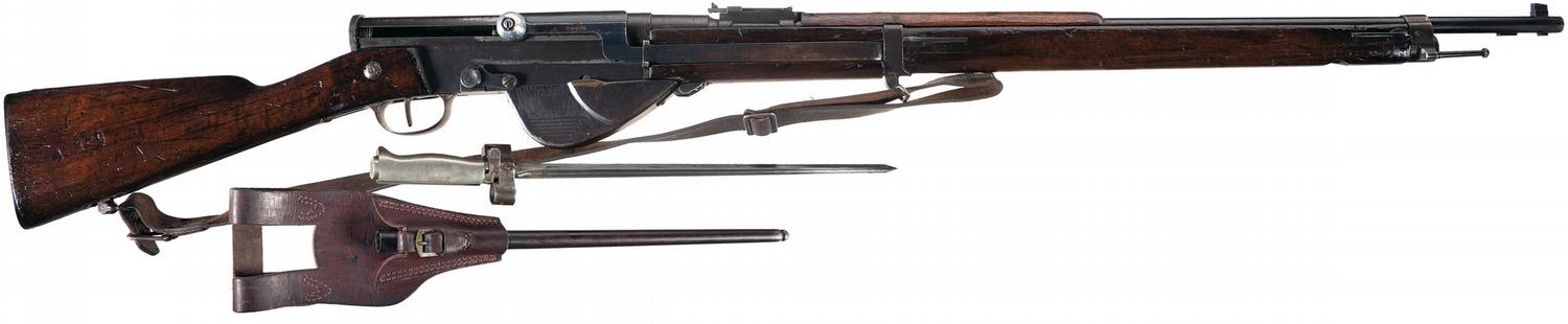 This is a scarce example of a French Model 1917 semi automatic rifle in 8X50 Lebel caliber as manufactured by one of the French Arsenals, during WWII. These rifles are so very unique in that they were developed in the 1916-1918 period when most of the countries in the free world were just trying to equip their armies with a standard, front locking lug, bolt action rifle. Here the French developed a very unique semi-automatic rifle that used three front locking lugs, with a "Rotating Bolt" system (similar to the front locking lugs found on the Canadian Ross straight pull rifles) which used a gas operated, semi-automatic mechanism to function the rifle. This system used a revolutionary concept in that the French installed a gas port on the bottom of the barrel to function a full length operating rod, mounted on the right side of the action to cycle the bolt. This design did not prove to be very robust and most were converted to a straight pull single shot rifle that were eventually sold or given to Colonial troops. These rifles are usually marked on the sides of the receiver with the factory markings however this rifle is marked on the sides of the barrel which may indicate a late production rifle. The right side of the barrel at the breech is marked "MA T.1917" and the left side is marked "LP" and circled "B" proofs and the serial number f28700 which matches the number on the cocking bar, forearm, and buttstock, with the number "f37346" ahead of the trigger guard. This rifle has not been converted and still has the gas port or cylinder mounted to the bottom of the barrel and it still has a "Brass Gas Plug" installed. Tangent rear sight, straight grip stock with upper handguard, and leather sling. The right side of the buttstock has a 1917 MA circle cartouche. With a bayonet numbered "FL46134" with scabbard.