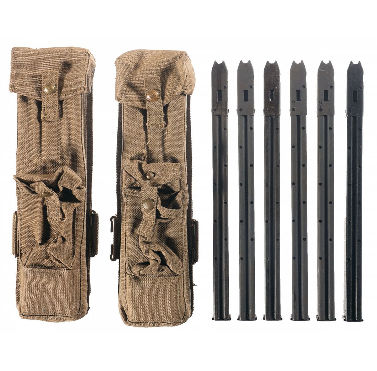 This is an excellent example of a fully functional WWII British MKII STEN submachine gun. These SMGs were the workhorse of the British and United Kingdom forces throughout WWII to include many US, and Free French Resistance forces as well as Allied paratroopers and special operations units. They were produced in several configurations with the MKII being the most widely used and remained well in service until the 1970s. They are a simple blow-back operated SMG that can be fired both in full or semi-automatic. They have three basic machined parts; the barrel, barrel bushing and bolt with the various remaining parts all produced from sheet metal stamping all welded together. It is estimated that well over 1 million were produced with an estimated manufacturing cost of approximately $9.00 each. During WWII they were produced by two primary factories, BSA Shirley and the Royal Ordnance factory at Fazakerley, as well as Canada and after WWII also in India. The top of the magazine well housing is marked "STEN MKII" with the underside marked "FK 71265" over "SECO & CO.". The receiver/tube itself is unmarked or proofed, with a small (PHX) etched on the right side, with the left rear trigger housing stamped "ENGLAND". This example has later "T" style buttstock and is complete with one 20 round and six 30 round Sten magazines, two canvas magazine pouches and an original canvas STEN sling. Currently the BATF paperwork list the manufacture of this weapon as "ENGLAND WWII".