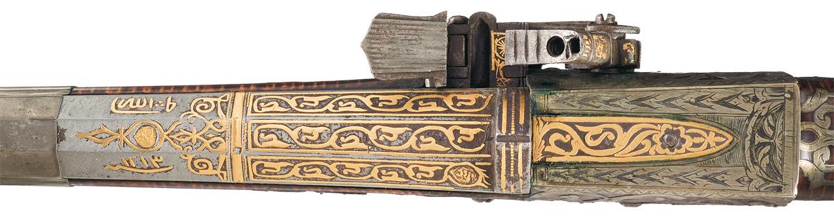 Condition: Very good, with strong traces of a Damascus pattern on the barrel, with spotting and a few areas of dark patina. A darker patina is present on the lock hardware, with the upper jaw absent from the hammer. Gold is strong, with a few small areas of flaking. A few cracks are present on the barrel bands. Stock is good, with an absent tip, minor cracks and pressure dents, and attractive grain. Ivory is fine, with a few small chips, minor age cracks and fine mixed color.