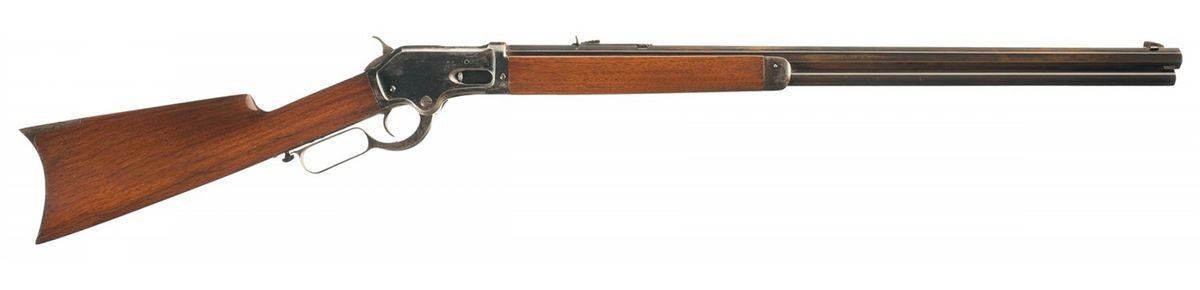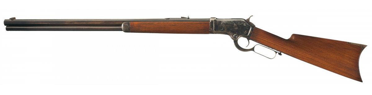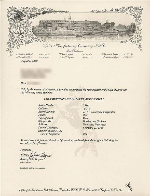 This rifle model represents Colt's only attempt to compete with Winchester for the lever action rifle market. A total of 3,775 rifles were manufactured between 1883 and 1885, 2,556 with octagon barrels. Fixed nickel steel blade front sight with adjustable semi-buckhorn sporting rear sight. The top barrel flat is marked "COLT'S PT. F.A. MFG. CO. HARTFORD, CT. U.S.A./+PAT. JAN. 7. 73. OCT. 19. 75.APR. 1. 79. DEC. 13. 81. JAN 3. 82.+" ahead of the rear sight, "+BURGESS'S PATENTS+" is stamped on top of the lever with the serial number on the lower tang just behind the trigger. The Rampant Colt is marked on the left side of the receiver. The rifle was finished blue with a casehardened hammer and lever. Full length 15 round tubular magazine and mounted with a smooth walnut forearm and straight grip stock with a steel end cap and crescent buttplate with buttstock compartment (cleaning rod not included). The accompanying factory letter verifies the caliber, 25 1/2 inch octagon barrel, blue finish, wood stocks and that it was shipped as 1 of 180 to Hartley & Graham in New York, N.Y. on February 21, 1885.