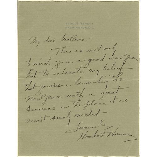 <B>Scarce Herbert Hoover Autograph Letter Signed</B></I> A.L.S. <I>"Herbert Hoover"</B></I> on his gray imprinted letterhead bearing his 2300 S Street address, 1p. , 6.5" x 8.25", Washington , n.d., addressed to <I>"My dear Wallace",</B></I> sending New Year's greetings. He writes: <I>"This is not only to wish you a good new year but to indicate my belief that you are launching the New Year with a great service in the place it is most sorely needed."</B></I> Although quite plentiful in typed letters signed, letters entirely in Hoover's hand are quite scarce. On a single sheet, this example is ideal for display. In fine condition, tipped to a larger sheet.<BR><BR><b>Shipping:</b> Flat Material, Small (<a target="_blank" href="http://www.heritageauctions.com/common/shipping.php">view shipping information</a>)