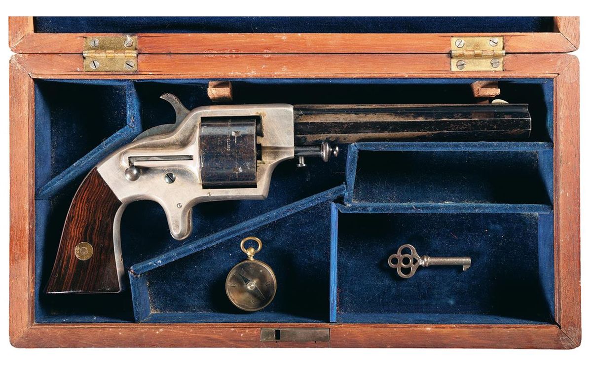 Near excellent. The barrel has 70% of the original blue with finish loss on either side of the rib. The cylinder has some age spotting but retains 90% of the blue finish. The silver plating on the frame is tarnished but nearly 98% remains. The hammer and spur trigger retain most of the muted case colors. The rosewood grips are excellent and have 95% or more of the original piano finish. The action is tight and functions perfectly. The case is very good with excellent markings on the lid. The velvet lining is bright with minor compression wear from contact with the revolver cylinder and grip. One partition panel is a replacement. This is a colorful one-of-kind revolver.
