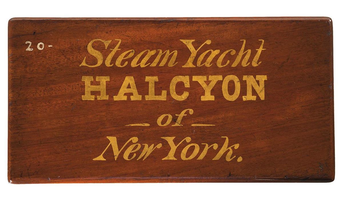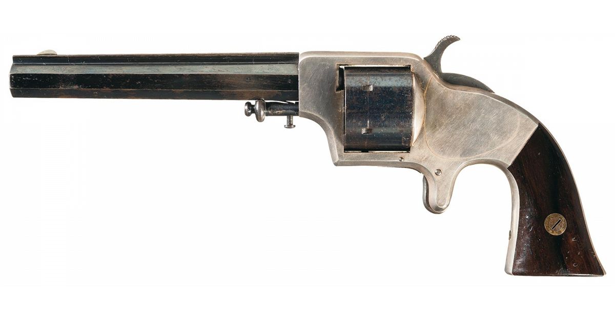 Single action spur trigger revolver manufactured by Plant's Manufacturing Company, New Haven, Connecticut c. 1865. The revolver has a blue ribbed octagon barrel, blue six shot cylinder, and silver plated brass frame. The hammer and spur trigger are color casehardened. The two-piece flat bottom rosewood grips have a piano finish. This Third Model revolver has a square front frame with sight groove in the top strap and distinctive ejector housing on the right side with round knob ejector. The front loading cylinder has a flat face. The top of the barrel rib is roll-stamped "MERWIN & BRAY NEW-YORK". "PATENTED, JULY 12, 1859 & JULY 21, 1863" is roll-stamped across the cylinder. The serial number "4512" is stamped on the butt. The Plant's Manufacturing Co., made approximately 7,300 Third Model Front Loading Army Revolvers in the mid-1860s. The revolver is complete with a mahogany partition case with five compartments lined with navy blue velvet. The case contains a small brass compass and a key. "Steam Yacht/HALCYON/-of-/New. York." is boldly painted on the case lid in gold letters. A copy of a July 2, 1902 NEW YORK TIMES article states that the Halcyon was a 125-foot steam yacht that was launched in 1875 that was owned by New York City banker Frederick F. Ames. The article details how the Halcyon foundered after breaking a propeller shaft in Long Island Sound on July 1, 1902. The painted case mahogany indicates that the Plant's revolver was part of the Halcyon's ships store sometime before her loss in 1902.