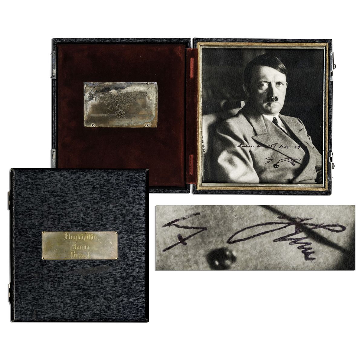 Very rare Hitler signed and dated photo, dated 24 August 1940. Photo is matted and framed in a sturdy black cassette presumably that once belonged to Nazi aviator Flugkapitan Hanna Reitsch, the only woman awarded the Iron Cross First Class and the Luftwaffe Pilot/Observer Badge in Gold with Diamonds during World War II. Her name is engraved to plaque affixed to cover of case. Photo depicts Hitler posing sternly, seated on a chair in a non-military suit. With date inscribed along bottom in German along with his ''Adolf Hitler'' signature in black ink. Framed with a metal plaque of the Nazi party emblem, the eagle atop the swastika symbol, opposite photo against red plush fabric matting. With provenance from Charles Hamilton, handwriting and manuscript expert. Letter reads in full, ''I certify that I have examined the frontal portrait of Hitler in civilian clothes, taken by Heinrich Hoffmann in 1938. This particular photograph is encased in a black leather, folding cassette containing a metal plaque on the exterior, bearing the engraved name of Flugkapitan Hanna Reitsch of the German Luftwaffe. Based upon my detailed analysis, I certify that both the date (24 Aug. 1940) as well as the signature written above the date are the authentic writing of Adolf Hitler. Further, this photograph was borrowed from a Canadian Collector and used as the basis for the writing exemplar of Adolf Hitler illustrated on page 191 of my book 'Collecting Autographs and Manuscripts', published by the University of Oklahoma Press in 1961. Lastly, I am the author of the standard work on Hitler's handwriting entitled 'Leaders and Personalities of the Third Reich'''. Photo measures 6.5'' x 7.5''; black case measures 7.25'' x 8.25'' with some minor wear to case, else near fine.