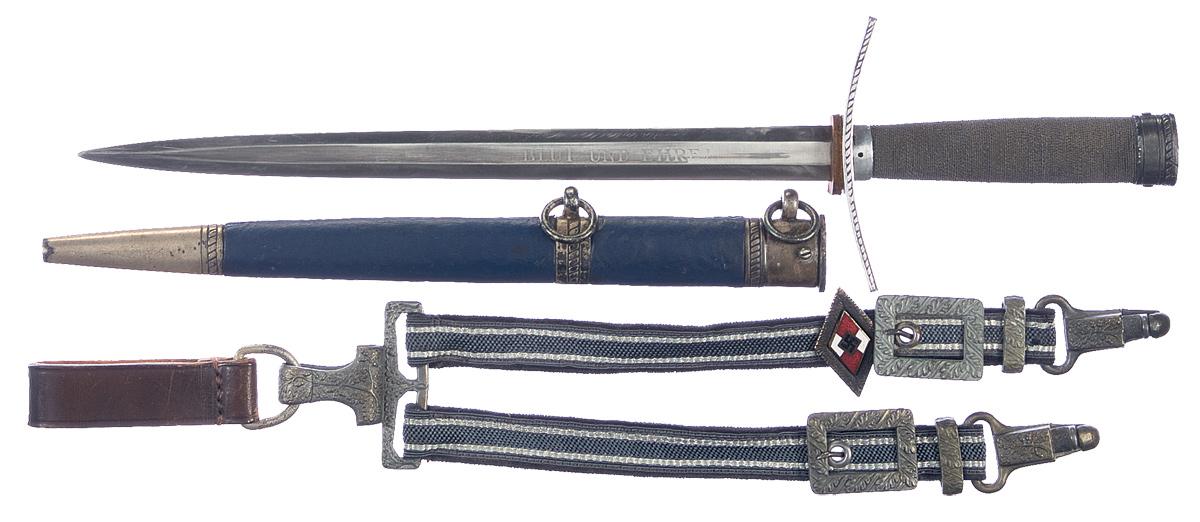 Produced for leaders in the Hitler Youth, these daggers were given as awards, and could not be purchased commercially. 9 1/2 inch blade, with "BLUT UND EHRE!" etched in block letters on the obverse, "7/3" RZM mark on the reverse. Engraved rope pattern on the alloy cross guard, which has a gentle upward curve and a rectangular profile, with braided wire grip and decorative silver pommel cap. Originally topped with the HJ logo, the cap has been ground down to render the swastika illegible. Similar grinding is visible on the sheath throat, with blue leather wrap, silver fittings, rope themed decoration, and a blue and silver wire belt hanger with oak leaf decorated hardware, midnight blue backing and a leather belt loop with RZM markings. Also included is a Hitler Youth pin, 1 1/2 inch wide with wreath border.