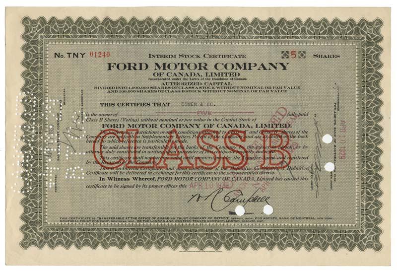 1929, Canada. Stock certificate for five shares of Ford Motor Company of Canada, Limited. Stamp and punch cancelled, but in fine condition overall. A scarce Ford Motors issue.
