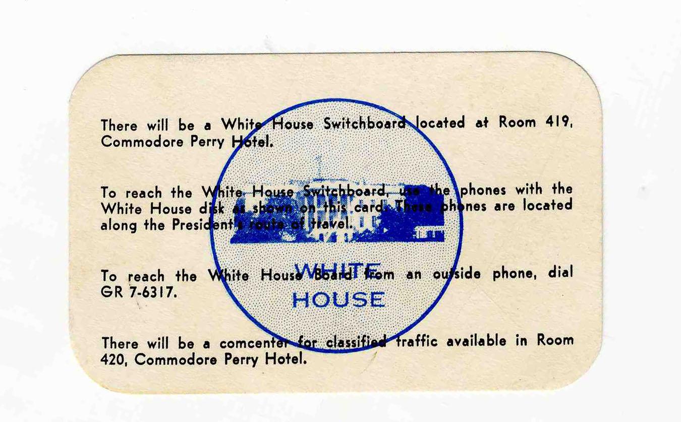 Exceedingly rare President John F. Kennedy collectible. Original switchboard card from the Commodore Perry Hotel, where Kennedy was supposed to stay on the night of his 22 November 1963 assassination. Though Kennedy was assassinated hours before he would have checked into the hotel, the Secret Service had already set up the White House switchboard at the Commodore Perry. An extremely small number of access cards were given to the Secret Service and top Kennedy staffers; according to several top Kennedy experts, only two of these such cards are known to exist and even Kennedy's personal secretary Evelyn Lincoln never had one. Switchboard card reads, “There will be a White House Switchboard located at Room 419, Commodore Perry Hotel. To reach the White House Switchboard use the phones with the White House disk as shown on this card. These phones are located along the President's route of travel. To reach the White House board from an outside phone, dial GR 7-6317. There will be a comcenter for classified traffic available in Room 420, Commodore Perry Hotel.” A true rarity and must-have for any JKF collector. Fine condition.