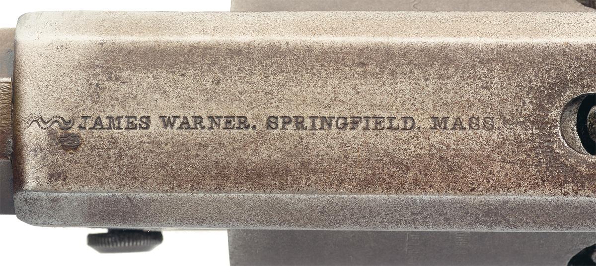 One of approximately 350 produced circa 1850s. Blade front and adjustable sporting rear sights, with the serial number on the underside of the barrel, wood cleaning rod, and a loading lever. The top strap is marked "JAMES WARNER. SPRINGFIELD, MASS." and the cylinder is stamped with the Warner patent marking. Manually turned cylinder, with the release lever inside the finger rest trigger guard. Smooth straight grip stock, with a metal buttplate and small storage compartment.