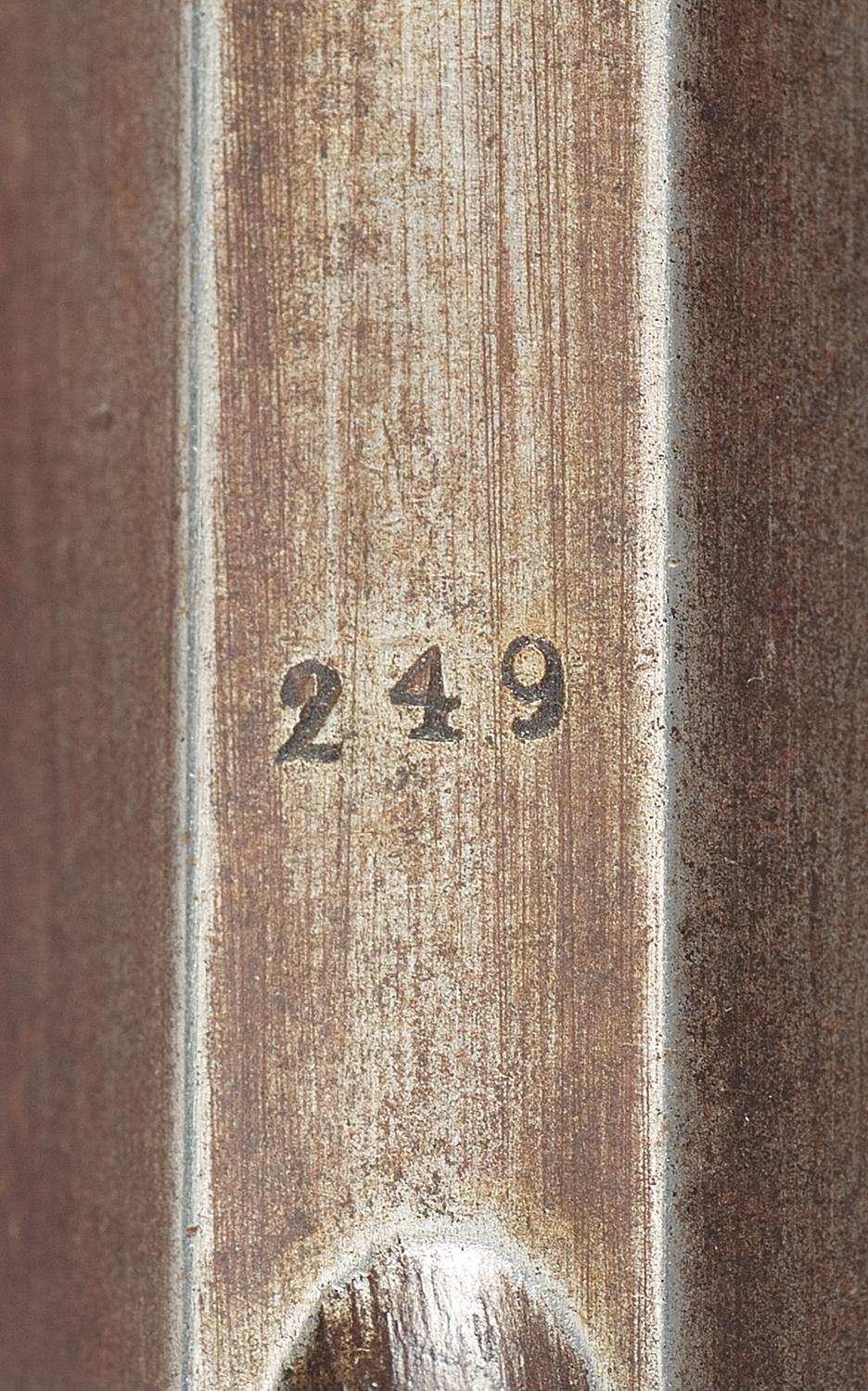 Condition: Good as partially refinished, with a smooth brown-gray patina, minor flash pitting and some evidence of cleaning overall. The loading lever has limited traces of original case colors. The rear ramrod channel has been repaired, and the rear sight is slightly bent. The refinished stock has a few hairline cracks near the tang and some scattered minor dings and scratches. Mechanically good.