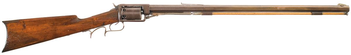 One of approximately 350 produced circa 1850s. Blade front and adjustable sporting rear (missing elevator) sights, with the serial number on the underside of the barrel, wood cleaning rod, and a loading lever. The top strap is marked "JAMES WARNER. SPRINGFIELD, MASS." and the cylinder is has 4 bands of dots with the 6 chambers numbered. Manually turned cylinder, with the release lever inside the finger rest trigger guard. Smooth straight grip stock with a crescent buttplate with a small storage compartment.