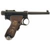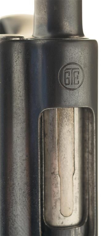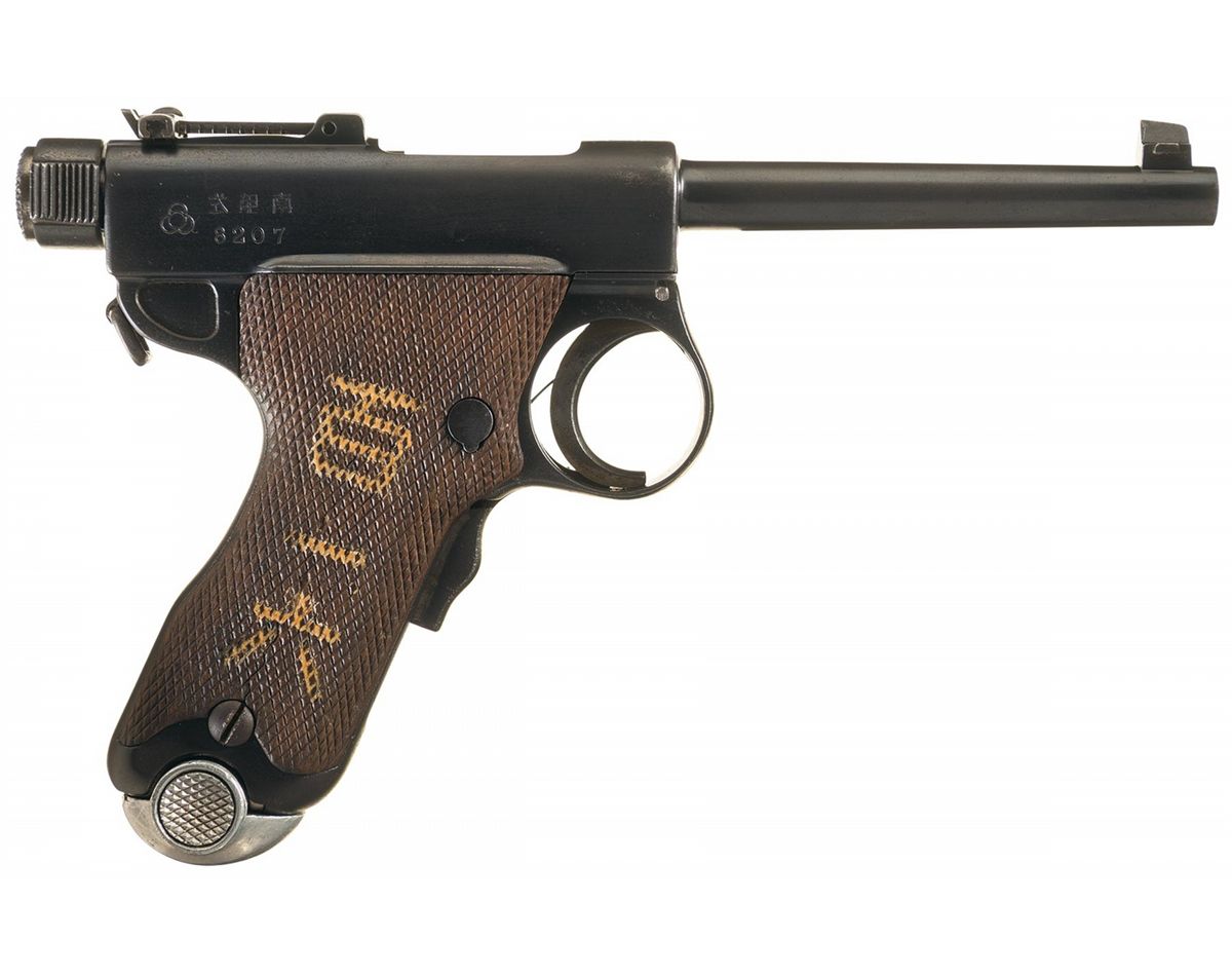 This is a very fine example of a Tokyo Gas and Electric manufactured Model 1902 Nambu pistol which collectors refer to as a Papa Nambu version, that falls into the scarce 8,000 series serial number range. These were produced after the 2nd variation, Tokyo Arsenal contract that was produced in the 1923-28 time frame with serial numbers in the 8,075-8,549 range, with only 525 of this series manufactured. These have been identified as having the one-piece frame with the milled side panels. This example is in slightly better condition than most known examples, as all of the Model 1902 pistols saw extensive service as a standard issue Japanese military pistol by both the Navy and Army. As noted this pistol falls into a very unique serial number range that was a pre-cursor to the next private purchase variations. The top of the receiver has the small intertwined "TGE" mark for the Tokyo Gas and Electric Company while the right side of the upper receiver is marked with the four intertwined cannon balls symbol of the Tokyo Arsenal, followed by three Kanji markings/proofs over the serial number "8207". These pistols are equipped with adjustable tangent rear sight calibrated from 50-500 meters and a fixed inverted "v" front sight, with front grip safety. The right grip panels is also adorned with three-white painted Kanji Characters. It is complete with a correct replacement nickel plated Papa magazine numbered "4869" on the spine. The striker knob is mismatched. The leather holster is an original "Papa" that has three Kanji characters painted on the front flap with the slightly wider, clam-shell cover. The front of the holster has the original ammunition pouch that contains two rows of loops; nine and seven each, inside the pouch. Inside the clam-shell are three more partial readable Kanji markings painted in white letters. This scarce pistol and holster lot is accompanied by a very desirable original WWII box of Nambu ammunition still sealed. The top of the box has several Kanji characters which identifies the ammunition as being "1st Tokyo Arsenal ammunition, Type 14 Showa date 20.2".