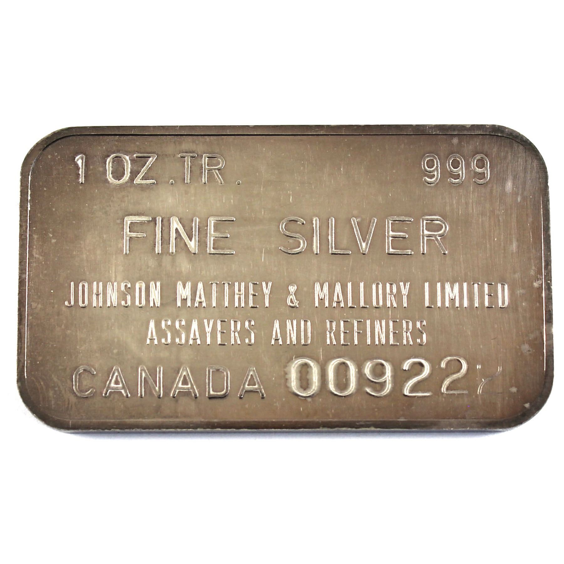 Scarce Johnson Matthey & Mallory - Canada 1oz Fine Silver Bar (TAX Exempt). Serial #009222.