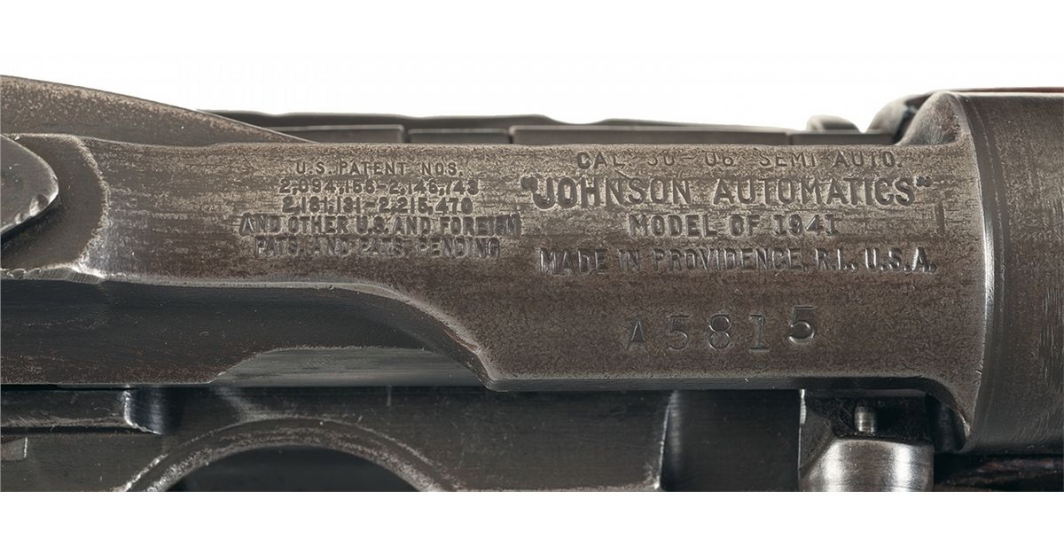 This is a solid example of a desirable Johnson Model 1941 Semi-Automatic Rifle. Developed in the late 1930's by Melvin Johnson. The 1941 competed against the M1 Garand for US military contracts, and found buyers with the Dutch and the USMC. Some Marine Raider and Parachute Battalions used them in the early Makin Island, Guadalcanal and Tulagi Island campaigns in the Pacific. These rifles employ several unique features such as the rotary magazine which allowed reloading at any time, an integral heat shield, and the takedown barrel which allowed them to be stowed in a parachute jump bag. Blade front and adjustable 1,000 meter rear sight. The barrel flange is marked ".30-06/41" and the barrel and barrel extension lug are stamped "0837J". The bolt is stamped "A8235". Has the five-line patent markings and four line maker markings on top of the receiver. Has a five-pointed star over "CRANSTON/ARMS/CO." in an upside-down triangle on the right side below the rear sight. Fitted with a smooth unlaminated two-piece pistol grip walnut stock.