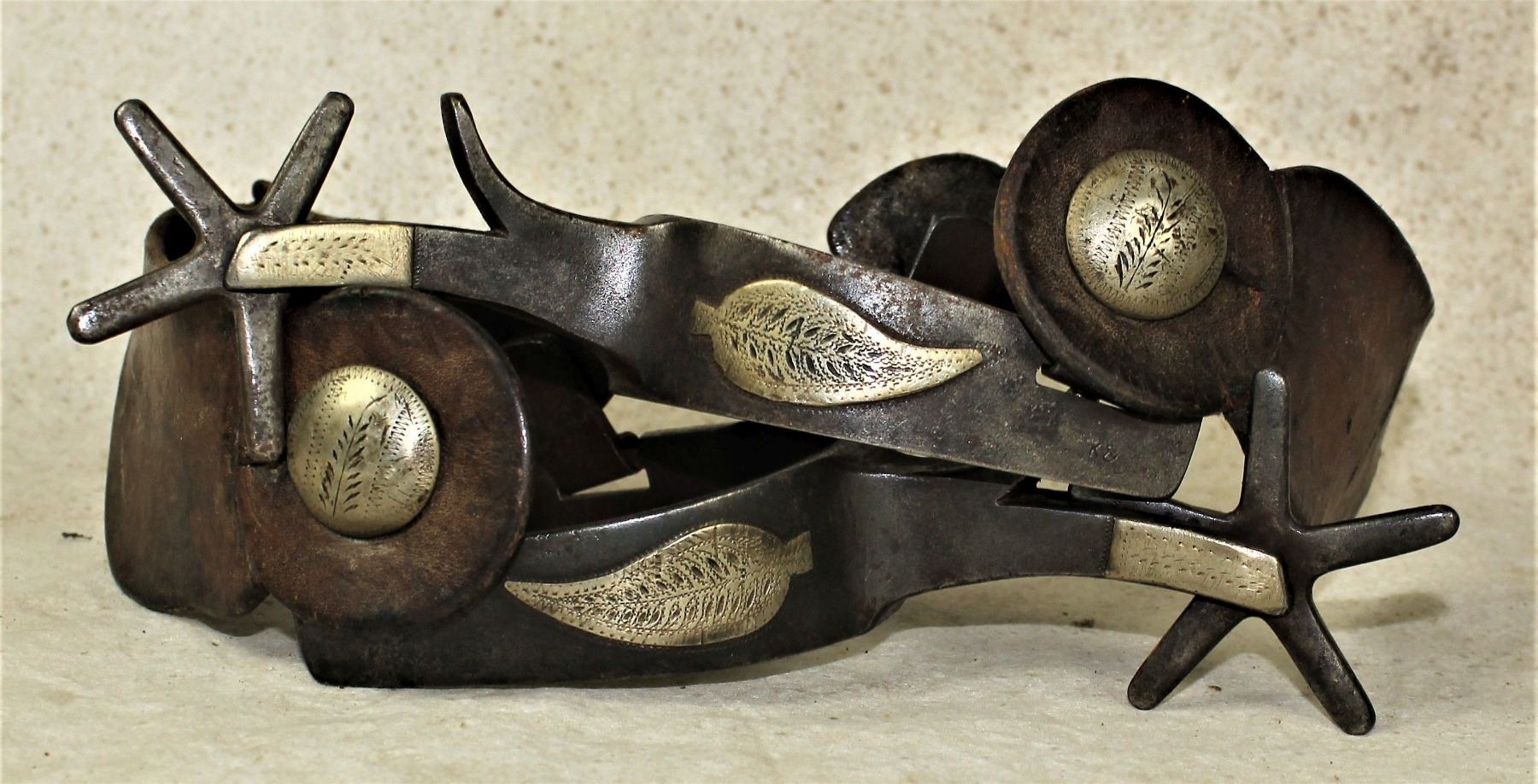 Single mounted pair of uncommon spurs with tapered heel bands, nicely engraved leaves, chap guards, and large 5 point rowels.