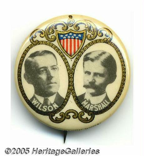 <B>Scarce Larger-size 1 1/4" Woodrow Wilson and Thomas Marshall Jugate Button</B></I> Wilson jugates larger than 7/8" have always commanded a substantial premium. Even in the late 1960s there was not a variety to be had for less than $100, and today many under $100 items of that era command well into four figures. This is an attractive 1912 design, seen mostly in 7/8" size, which can be reasonably mated with a similar jugate for the opposing William Howard Taft and James Sherman ticket. Choice condition. Lot:262