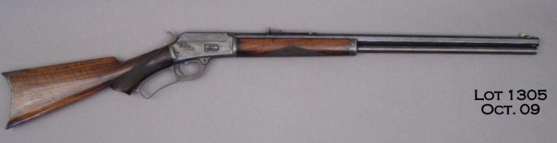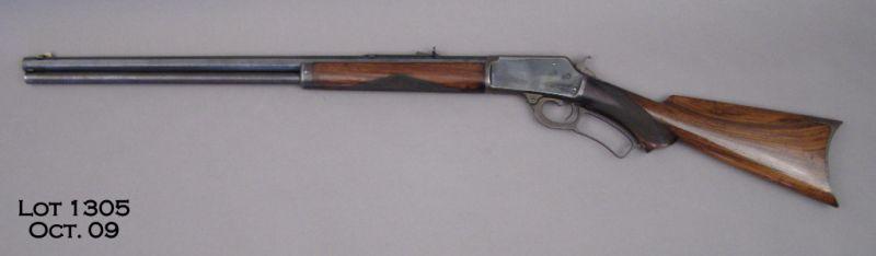 Scarce Marlin Model 1889 deluxe lever action rifle, .44 W. cal., desirable 24” octagon barrel with full magazine , blue finish, checkered pistol grip wood stock with rifle butt plate, #36401. This gun is in overall very good condition showing approx. 80%-90% original finish, crisp action, good bore, sharp markings, very good checkering to fore end and pistol grip, finely grained butt stock. A really nice 1889 in the most desirable caliber and configuration. Est.: $5,000-$10,000.