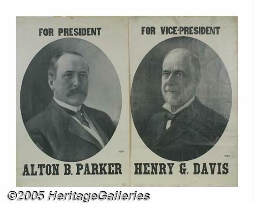 <B>Scarce Matched Pair of Large 1904 Parker and Davis Posters</B></I> Nowhere is the disparity in popularity between the Democratic and Republican tickets more apparent than in the population of political posters from that year. We must have seen well over 100 Teddy Roosevelt posters over the years for every one Alton Parker poster! His runningmate, Henry Davis, was 80 when nominated, and did not live until the election! This fine pair of posters displays as a large jugate. Each is 21" x 28" and shows minor "aging," but both are in essentially excellent display condition. Lot:261