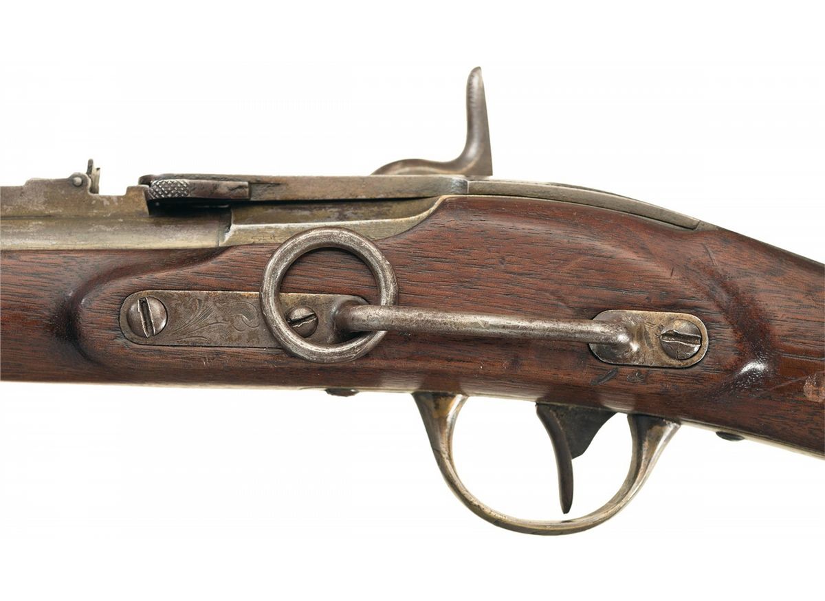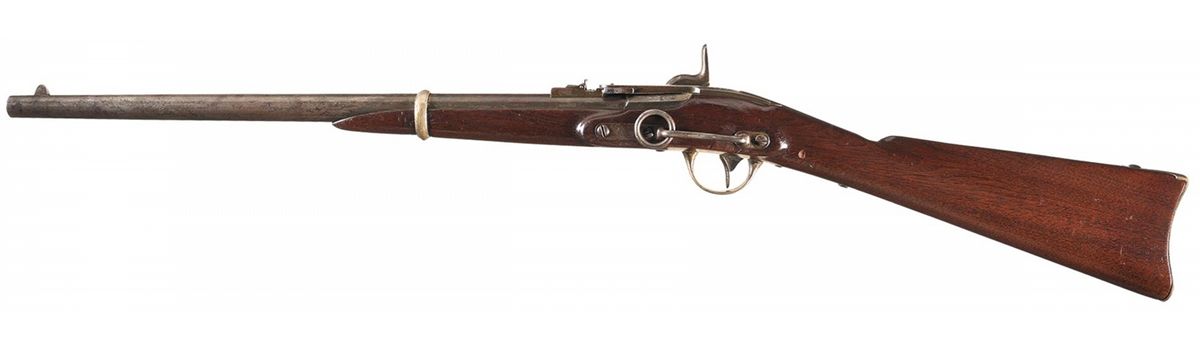 This type I single shot breech loading carbine was manufactured by J.H. Merrill of Baltimore, Maryland, circa 1862. The carbine is a high grade version or Officer's Model manufactured for commercial sale that features sliver plating on the barrel band, trigger guard, patch box and buttplate. It also has well executed open scroll engraving on the top of the breechblock, front and rear edges of the lock plate, hammer, sling bar mounts, trigger guard, patch box and buttplate. The carbine has a round barrel with iron front sight blade and two-leaf folding rear sight. The breechblock has the early knurled latch. A carbine sling bar and ring is attached to the left stock flat. The black walnut stock has the small patch box found on type I carbines. The lock plate is roll stamped "J.H. MERRILL BALTO/PAT.JULY, 1858/APL 9 MAY 21-28-31" in three lines in front of the hammer. The serial number "2840" is stamped vertically on the lock plate behind the hammer and on the top of the breechblock. The top of the breechblock is stamped "J.H. MERRILL BALTO/PAT.JULY 1858". The Ordnance Department purchased nearly 15,000 Merrill Carbines during the Civil War. Commercial production carbines like this example are very scarce.