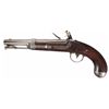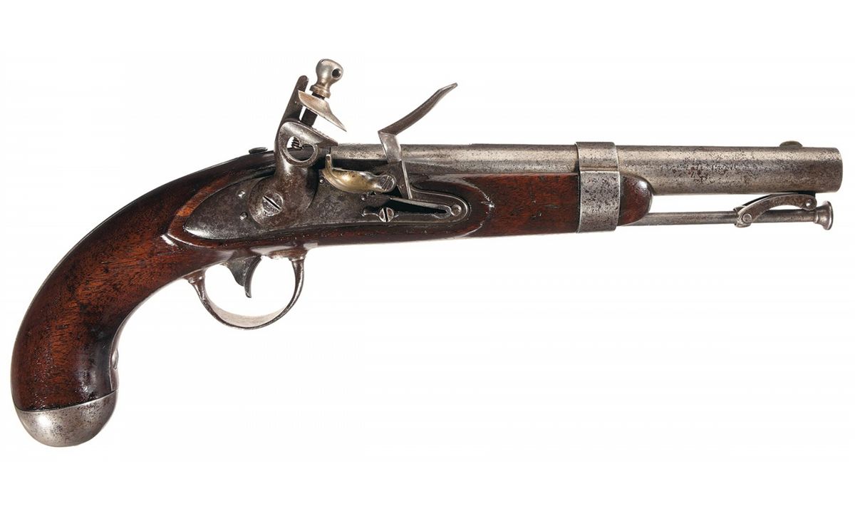 This is an example of a rare Variant Eagle marking U.S. Model 1836 flintlock pistol. The lock is marked only with an awkward Eagle motif with a shield on it's chest ahead of the hammer and there are no other makers markings present. The double necked hammer retains the heart shaped piercing instead of the usually found circular piercing. It conforms in every other way to the standard Model 1836. Very little is known about this type and it is possible that it is a prototype or developmental piece for a special militia contract. Its unknown how many exist. The breech end of the barrel is marked "US/JM/P". There is a "J" stamped on the left side plate and lower tang. The pistol is armory bright, with iron mountings and a detachable brass flash pan, iron swivel ramrod with button head, full back strap extending from the butt cap to the barrel tang and mounted with a smooth walnut stock.