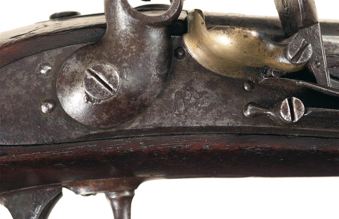 Fine. The metal surfaces, except the lock, frizzen and hammer, have a smooth mottled silver gray patina, while the frizzen, hammer and lock have a smooth mottled brown patina. The stock is also very good with a few scratches on the left flat, a small pieced-in repair at the rear of the lock, and overall some scattered minor scratches and dents. The action is excellent.