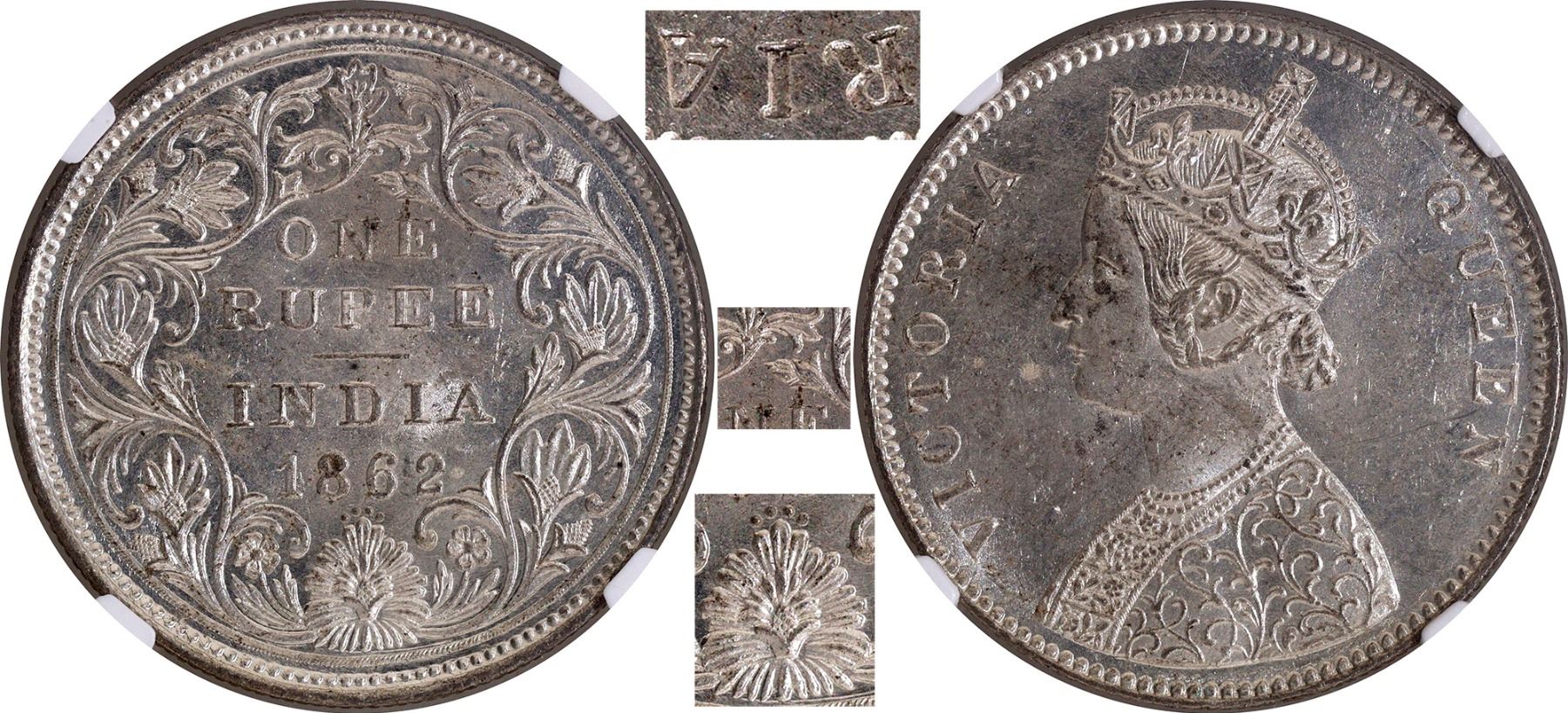 1862, Victoria Queen, Silver Rupee, Bombay Mint, A/II/0/4 dots, second ‘I’ in VICTORIA looks like flat top numeral 1 type, without initial J, the actual year of minting 1866, bud flower is double struck, (PR # 79/GK # 308), graded & slabbed by NGC as MS 61, Scarce.