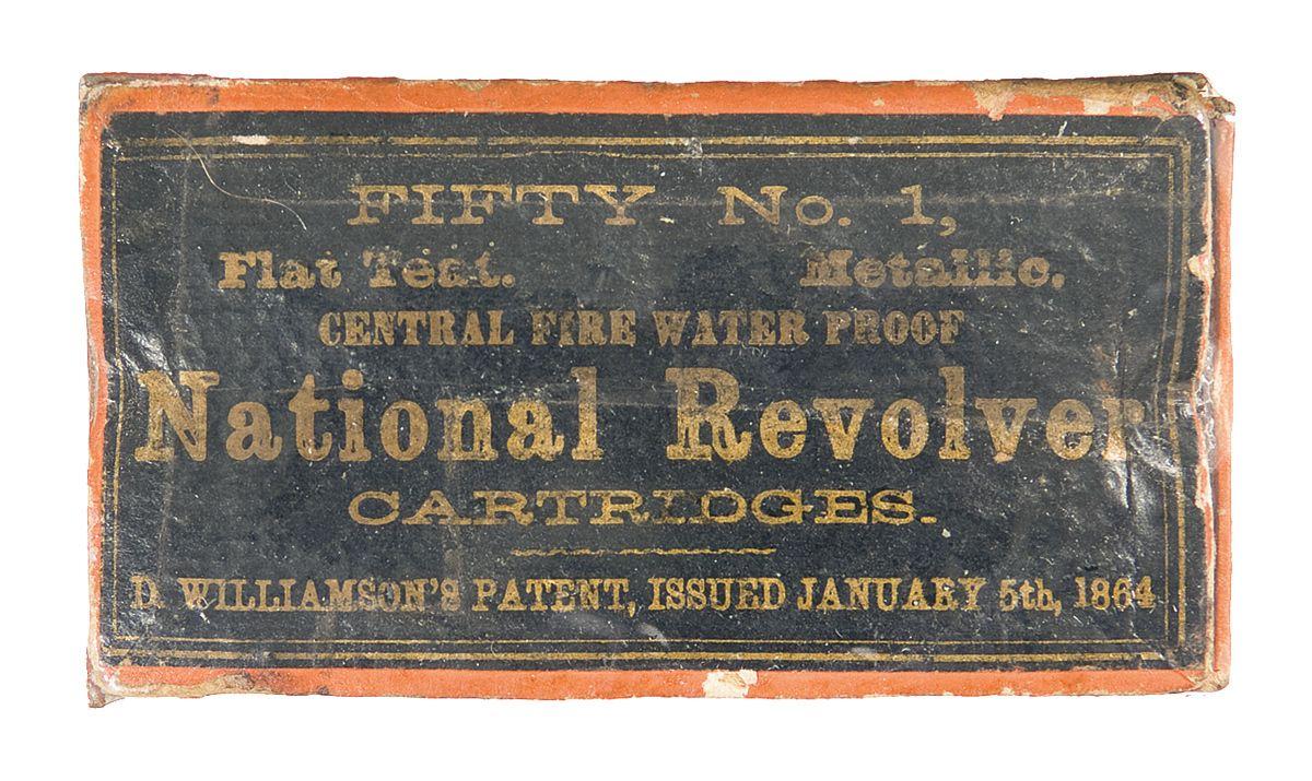Orange box with black lid label printed in gold lettering, contains 3 original rounds. Two lid sides absent, otherwise good.