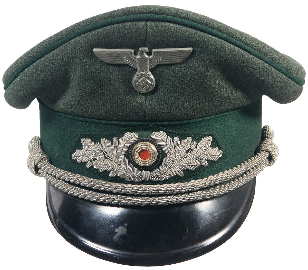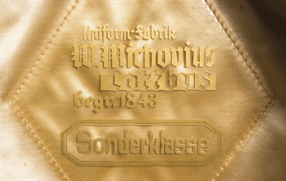 Peaked cap style, with green piping on gray felt, the Nazi eagle on the peak, and a green band with cockade surrounded by a silver bullion wreath, Black patent leather visor, with silver cord chinstrap. Brown leather sweatband and yellow silk lining, with gold printed label "Uniform - Fabrik/ W. Michovius/ Cottbus/ begr. 1843/ Sonderklasse", a supplier of uniform knives and uniforms for the forestry service operating out of Brandenburg.
