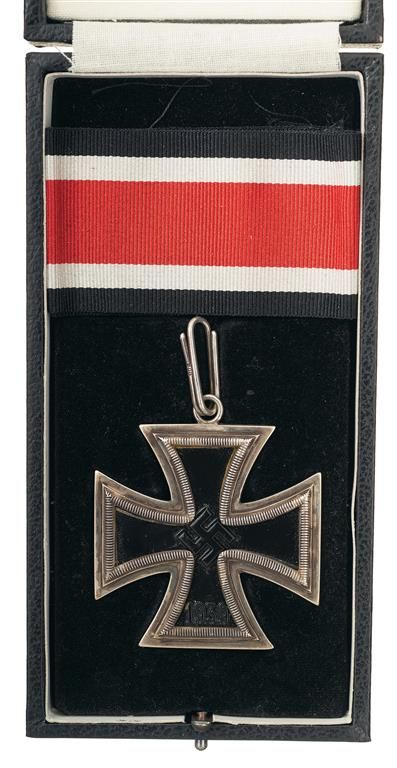 Introduced in 1939, The Knight's Cross of the Iron Cross was the 3rd combat valor decoration in the Iron Cross line, ranking above the 2nd and 1st Class Iron Crosses. Though later variants of the Knight's Cross would outrank it, for a time the Knight's Cross was the highest combat decoration in the Third Reich, and (with rare exceptions) only available to men who had already seen enough combat to earn the 2nd and 1st Class Iron Crosses. Measuring 1 7/8 inches across and 2 1/8 inches tall, the front bears a swastika over "1939", with "1813" on the rear, black painted interior and uncovered silver border with "800" and a sideways "2" stamped on the rear just below the hanging ring and "800" on the silver hanger. The Cross comes in a black leatherette case with white silk and black velvet lining, along with a red, white and black neck ribbon.