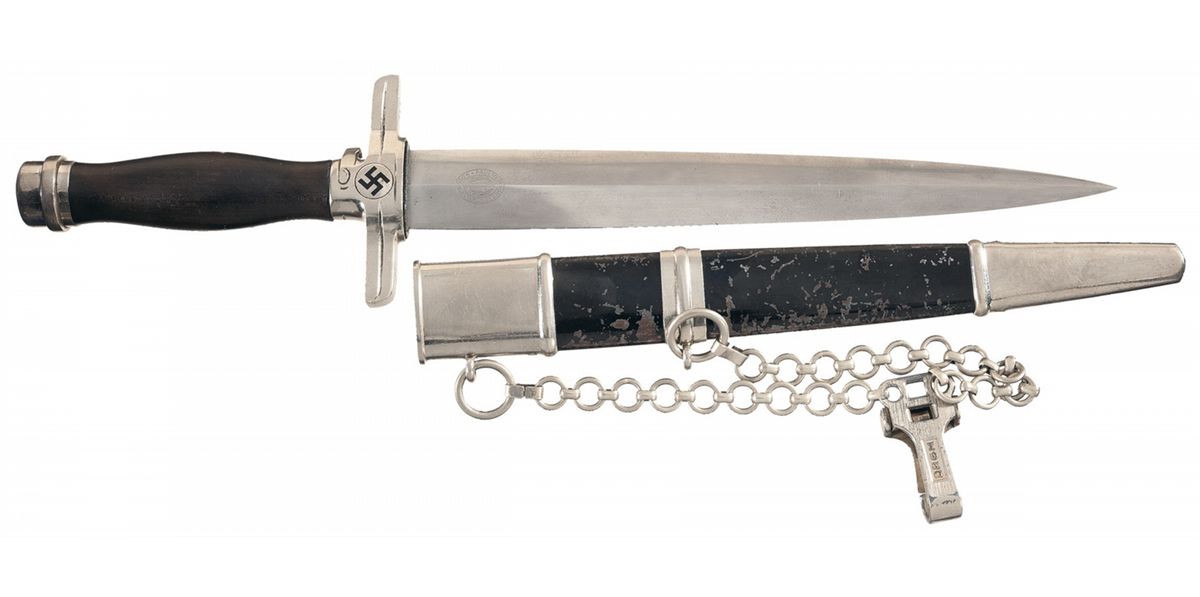 Founded in 1933 as a subset of the Sonderpolizei, and later absorbed by the SS, the Postschutz was responsible for providing physical security for the German Post Office, which was the controlling organization for mail, television, telephone and radio operations in the Reich. In 1939 the Postschutz-dolch was developed and authorized for wear by subordinates up to Senior NCOs. The blade has 9 5/8" double edged point blade with the Paul Weyersburg (Solingen) marking on the left ricasso. Nickel finished pommel and guard, with the latter shaped like a spread winged eagle with a black swastika on its chest, smooth wooden grip is marked with the post office logo. The underside of the guard is marked "117/ DRP". Black enamel painted scabbard, with nickel throat, tip, suspension band and chain belt hanger.