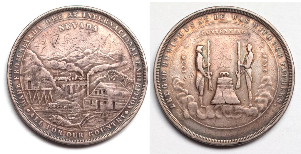 Scarce. This is a centennial coin authorized 1 dollar silver coin made from Nevada ore, crushed at the Philadelphia celebration, and minted at the Philadelphia mint. There were 2526 coins made for the celebration. The coin has a minuteman and an American soldier facing the Liberty bell on opposite sides and they are standing on clouds. 1886 is scratched into the face. From the Maish Collection of Nevada Tokens!City: County: State: NVDate: