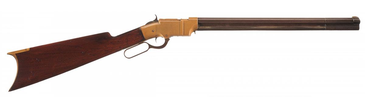 Manufactured by the New Haven Arms Co. c. 1857. The carbine has a 16 1/2 inch blue octagon barrel and integral magazine, brass, gunmetal receiver and crescent buttplate and casehardened hammer and loading lever. The straight grain walnut stock has a varnished piano finish. The barrel has a nickel silver half moon front sight blade. The top of the receiver has a rear sight dovetail. The top of the barrel is roll stamped with the one line legend "NEW HAVEN CONN. PATENT FEB. 14, 1854". This modified legend was introduced in April 1857 after Oliver Winchester took control of the Volcanic Repeating Arms Co., and reorganized it as the New Haven Arms Co. The serial number "148" is stamped on the shank of each of the hand-fitted stock and buttplate screws and stamped on the inside of the buttplate heel and heel of the stock. All of the visible serial numbers match. The revolutionary Volcanic repeating carbines and pistols featured self-cocking lever actions, integral magazines and were chambered for a cartridge with self-contained propellant and primer. Although the Volcanic pistols and carbines were not a commercial success, the development of reliable cartridges allowed the Volcanic lever action and integral magazine to serve as the basis for the Henry Rifle and the Model 1866 Winchester. The investments of shirt manufacturer Oliver Winchester in the Volcanic Repeating Arms Co. led to the establishment of the New Haven Arms Co. and the Winchester Repeating Arms Co.