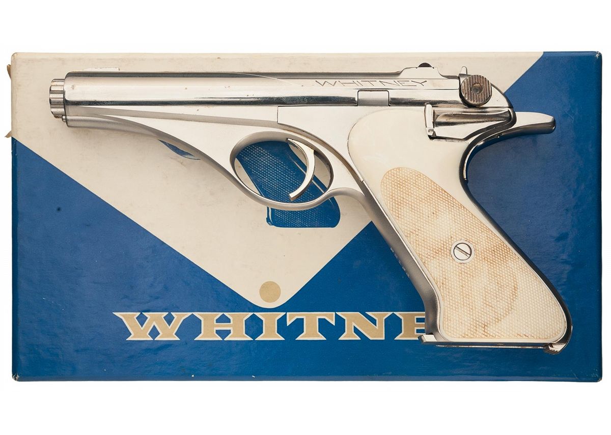 Between 1955 and 1962 Whitney Firearms Co. manufactured a total of 22000 Wolverines, only 9000 with a nickel plated finish. Aluminum alloy frame with fixed sights, white checkered grips and a detachable 10 round magazine. The upper left rear of the frame is marked "WHITNEY" and the right side is marked with the one line New Haven address. Complete with the original factory box numbered to the gun.