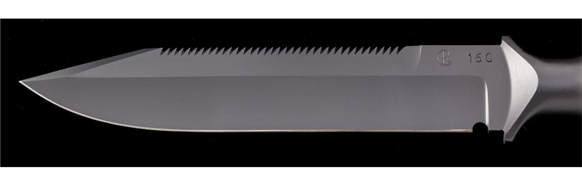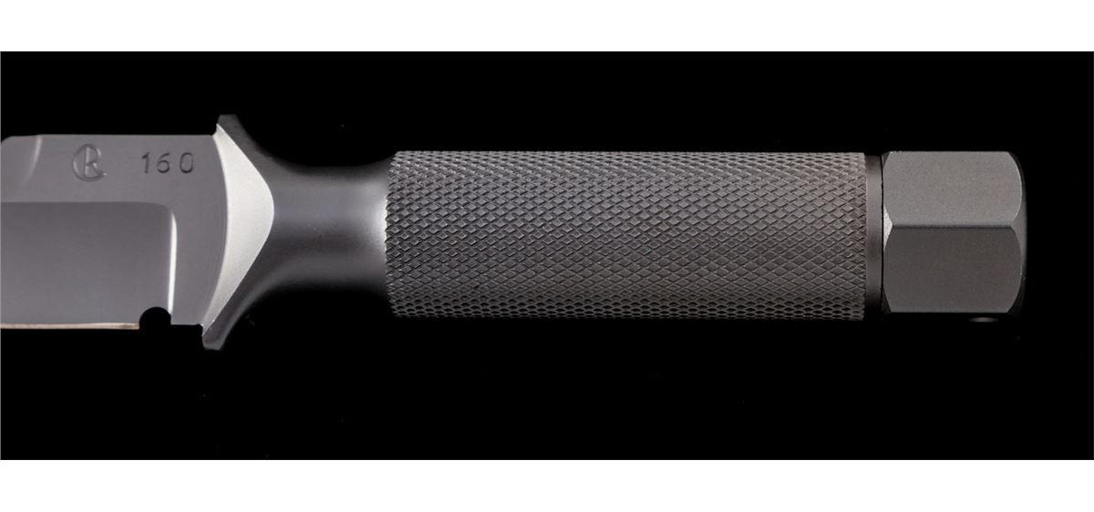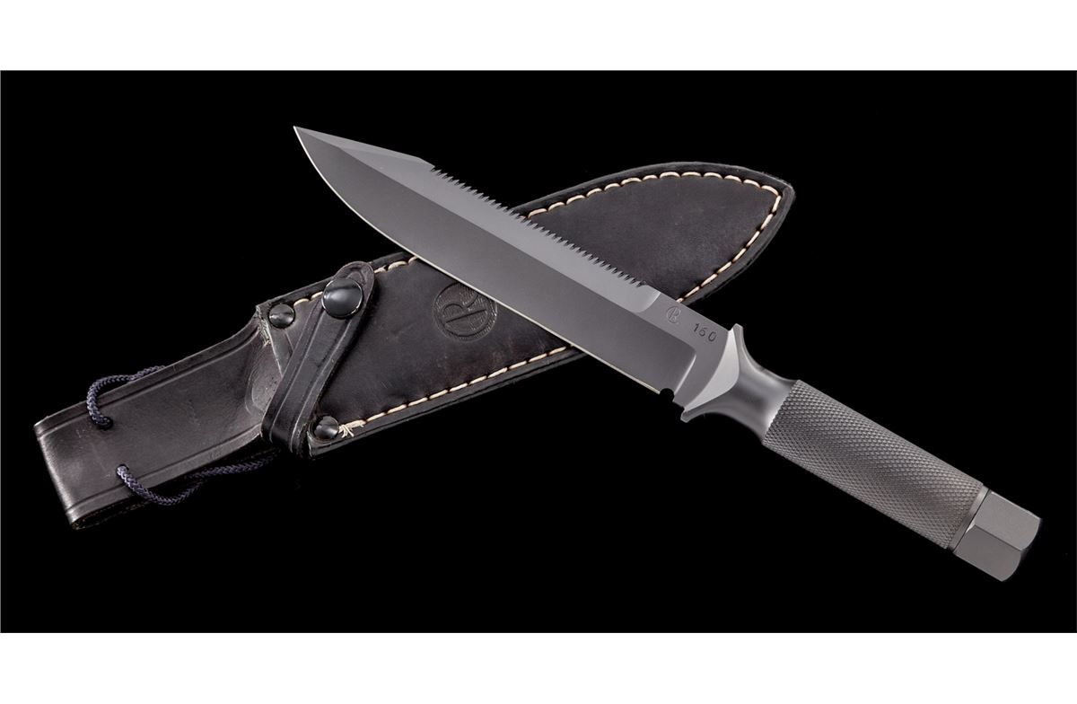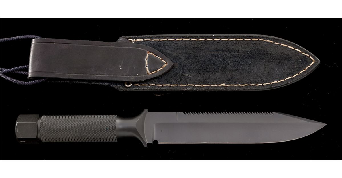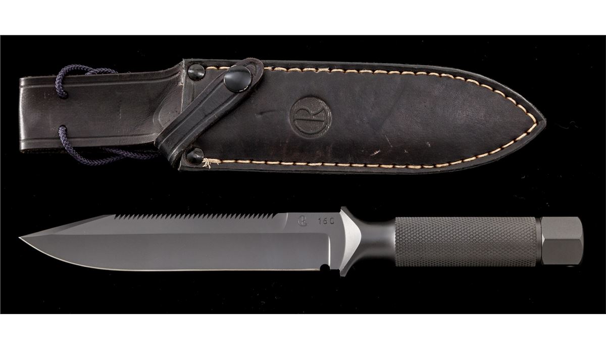 Scarce Numbered Chris Reeve ''MKIV'' Hollow Handled Survival Knife, of solid one-piece construction, 7''clipped point sawback blade marked ''CR'' and numbered ''160''; 11-7/8'' overall length, knurled handle, removable smooth aluminum butt cap with rubber o-ring. Black leather sheath is stamped ''CR'' on the front and comes with a black leg wrap. Condition is excellent showing no use. Knife show very few overall light marks from handling. Sheath with scuffs and scratches from storage and the leg wrap has been modified. Est.: $500-$800. (Ian Shein estate)