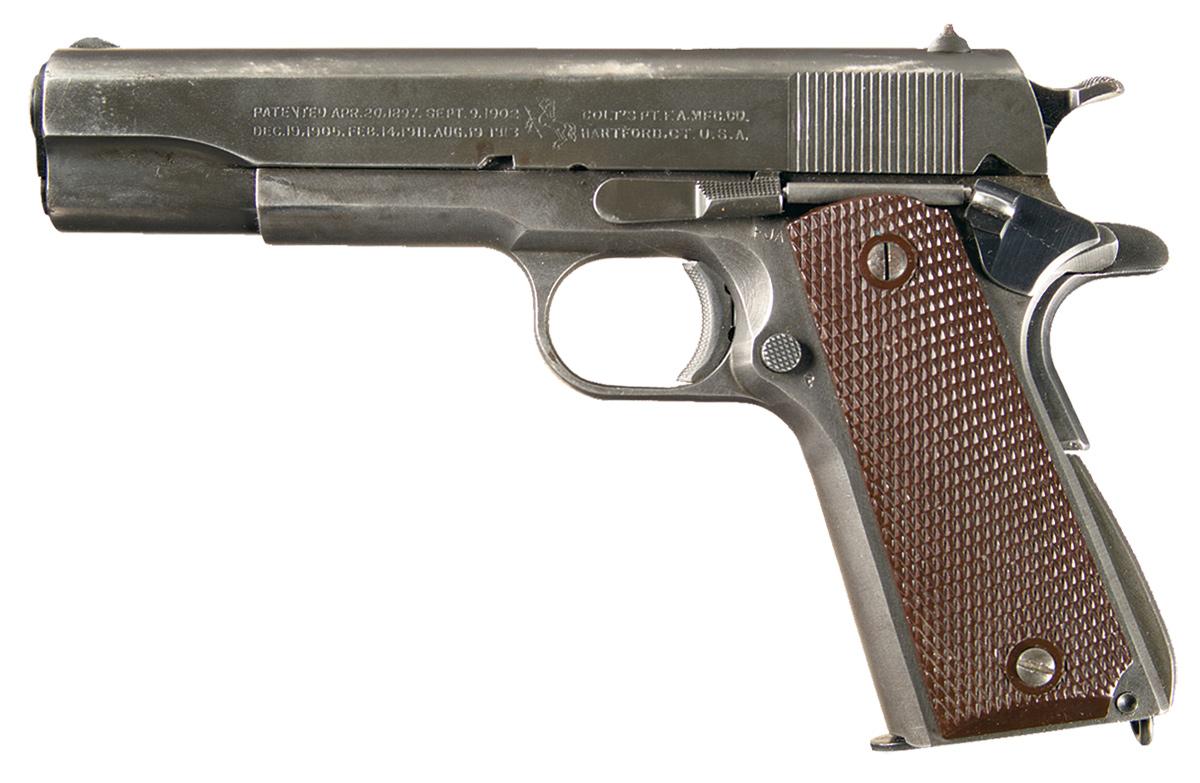 This early 1943 production Model 1911A1 pistol was manufactured by the Ithaca Gun Company using a Colt Model 1911A1 frame. In the later part of 1942 and the beginning of 1943, the Ithaca Gun Company purchased approximately 2200 frames from Colt to increase their production. These pistols are shown in the Colt serial number range with Ithaca inspector/proof markings. The pistol has a mid-war pattern slide marked on the left side with the two line, two block Colt patent/address markings along with the Rampant Colt in the middle of the markings and the "P" proof on top in front of the rear sight. The number 1133594 is marked around the firing pin hole. Standard U.S. property markings on the right side of the frame, with the crossed cannon ordnance proof behind the right grip. The left side of the frame has the "FJA" inspector marking of Col. Frank J. Atwood, with a "P" proof next to the magazine catch. A small "o" is marked on the right front of the trigger guard bow. It has the earlier wide Colt hammer, an early Ithaca arched mainspring housing with the narrower checkering, and a WWII High Standard replacement barrel that is marked with "HS" and "P" proofs on the right and left side of the lug. Fitted with Colt style brown plastic checkered grips with the reinforcing rib inside, with the single mold numbers, and the larger reinforcing ring around the screw holes. Complete with a blued magazine marked "R" on the lip of the front of the base plate and "C-R" on the bottom of the base plate.