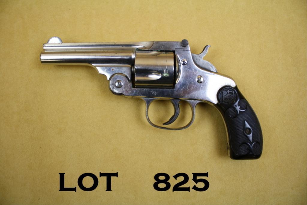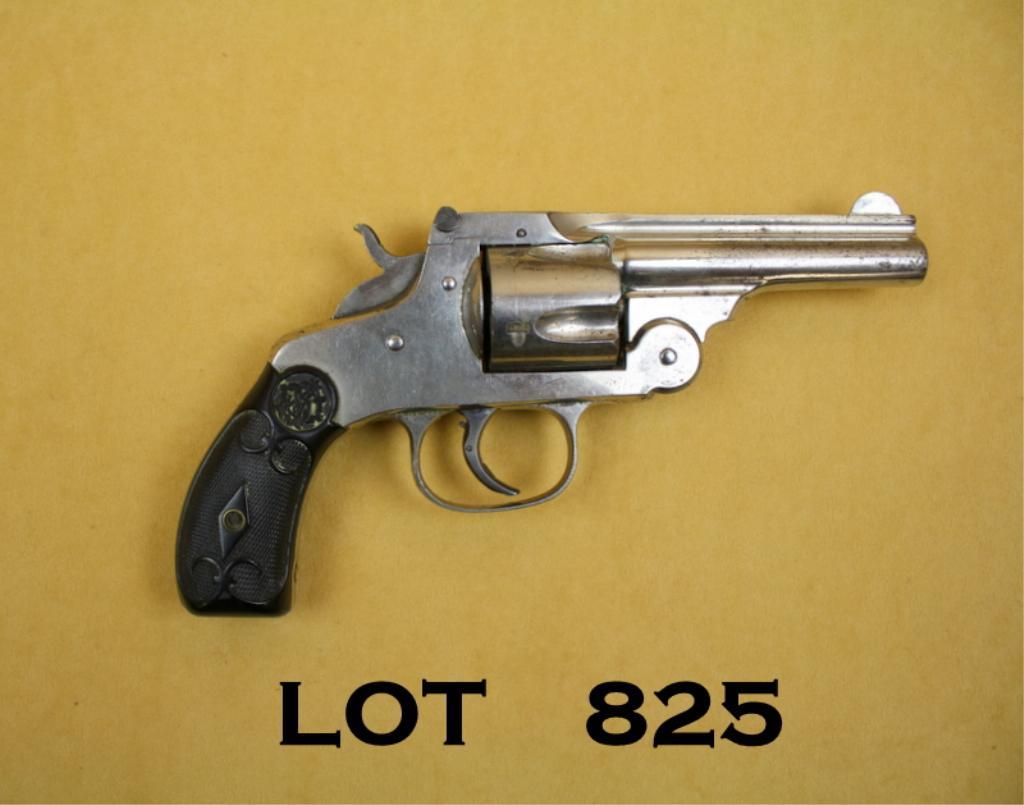 Scarce Otis A. Smith model 1887 double-action .38 caliber 5-shot revolver, nickel finish, 3-1/4” barrel, fancy hard-rubber grips. Serial #26525. The revolver shows 90-95% original nickel, some slight erosion and peppering, beginning age, no cleaning or polishing, good edges, good markings, good action. The unusual tip-up release was a bad idea to say the least. A very unusual and seldom-encountered double action revolver. Est: $200 - $400