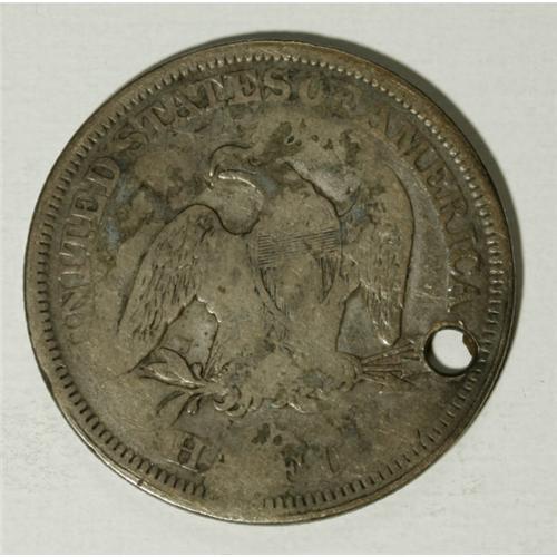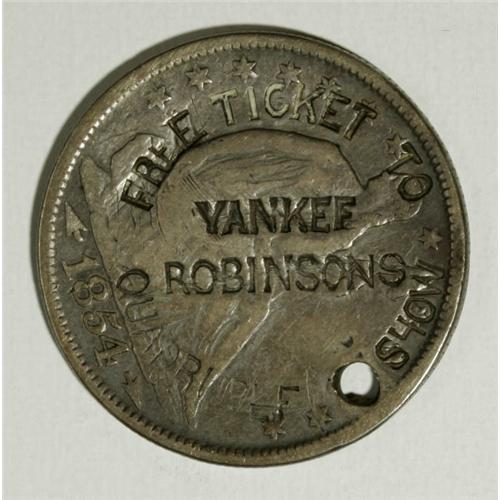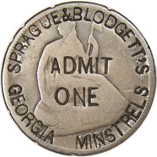 <B>Scarce Pair of Counterstamped Seated Half Dollars.</B></I> Two very scarce pieces: an 1876-S counterstamped by Sprague & Blodgett's Georgia Minstrels Admit One, Sprague & Blodgett was a traveling show that employed singing minstrels of the day, one of the famous persons associated with this company was black American Charles Hicks, who is reported to have placed this type of coin into circulation to hype the show before it showed up in town, the consignor indicates this is from a Jan. 31, 1985, Kagin's auction, lot 1011; and an 1854 Arrows counterstamped Free Ticket to Yankee Robinsons Quadruple-Show, Rulau-OH-Ci-180. A great pair of scarce counterstamps sure to enhance anyone's collection. We expect spirited bidding on this pair. The market value is approximately $400-$600.<BR><BR><b>Shipping:</b> Coins & Currency (<a target="_blank" href="http://www.heritageauctions.com/common/shipping.php">view shipping information</a>)
