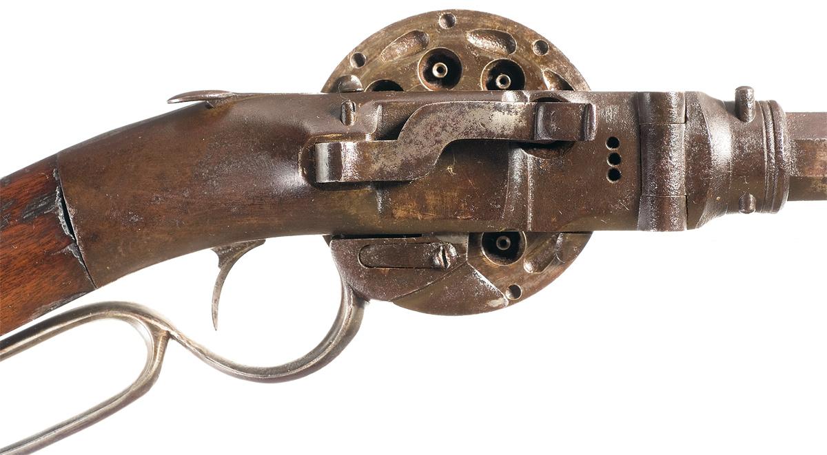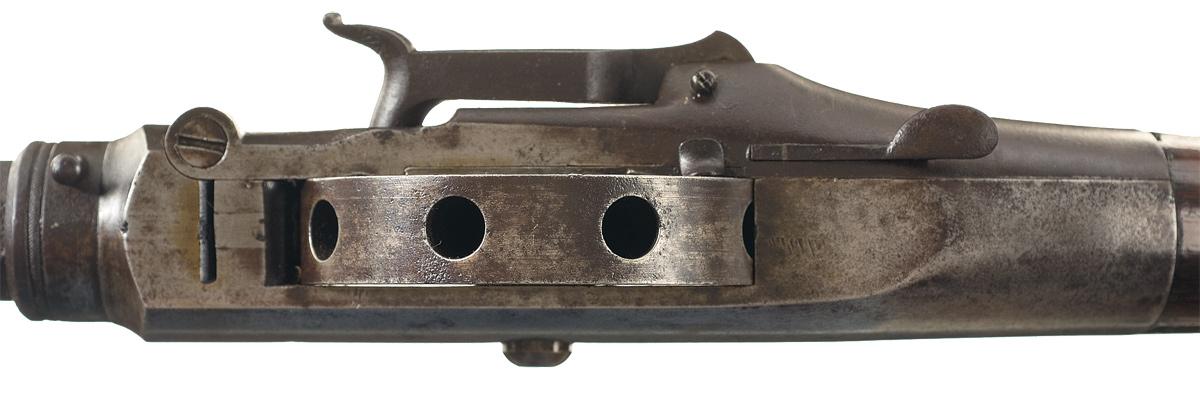 This scarce Third Model Porter Turret Rifle is quickly recognized by the absence of a magazine, the visible percussion nipples and side mounted hammer. When the lever is lowered, the hammer cocks and when pulled back up, the nine shot turret advances. The rifle correctly does not have provisions for a loading lever or a turret cover. The only visible marking is the serial number on the bottom barrel flat at the breech. The matching number is also marked on the turret, right side of the frame and inside of the hinged portion of the receiver. Blade front and elevation adjustable rear sights (both off-set to the left). Mounted with a varnished straight grip stock with a crescent buttplate.