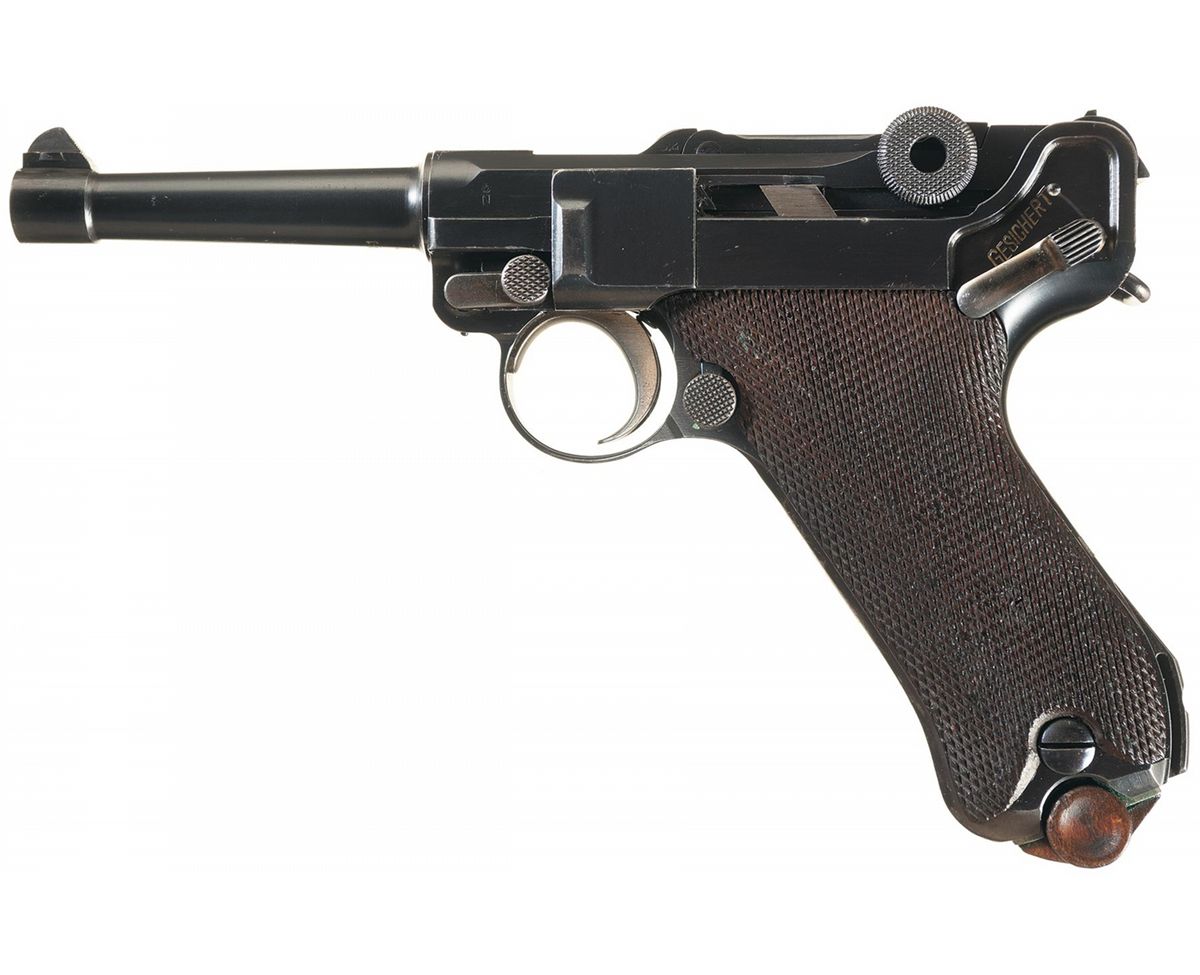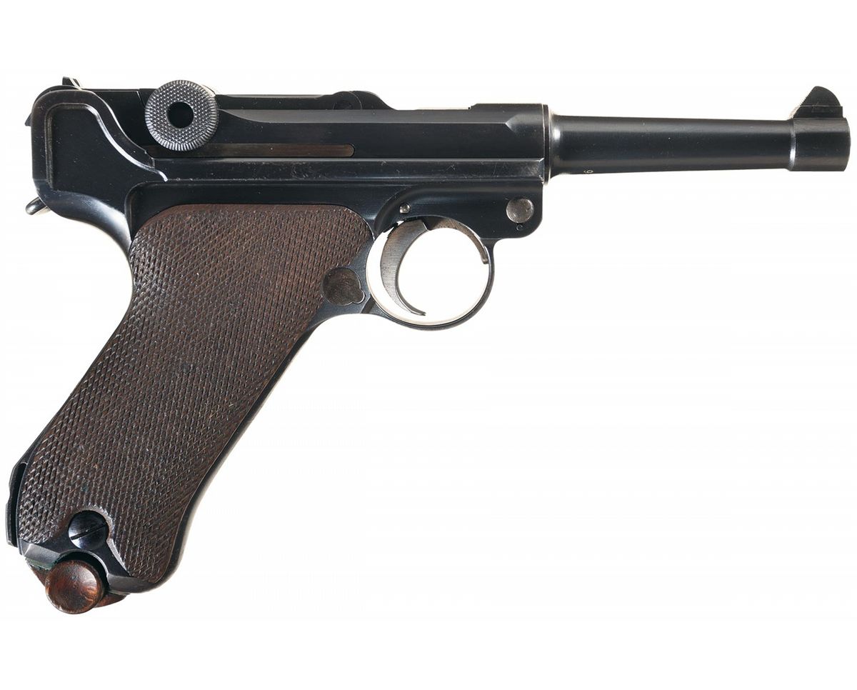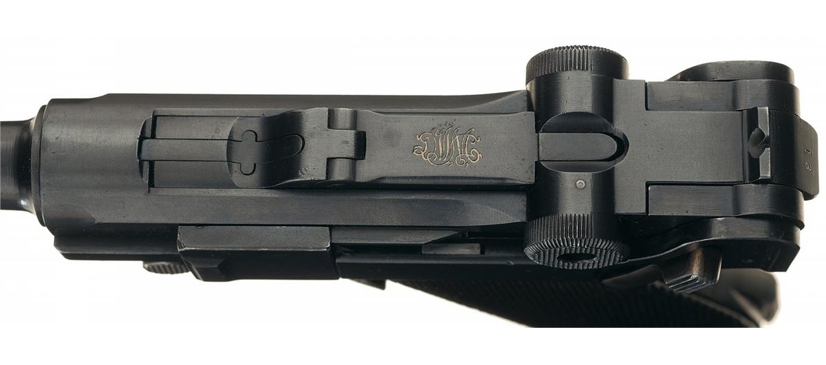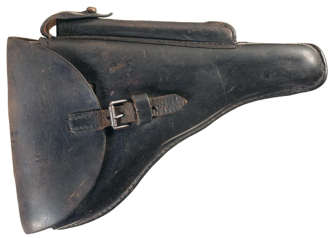 This is a unique example of a early post WWI DWM commercial Luger pistol with an interesting history. This Luger is a 1920 Commercial in the 9mm parabellum caliber (nearly all were 7.65 mm commercial auto caliber). It was later recalled and issued during the build up of the Weimar Navy. It has the standard "Crown/N" commercial proofs on the left side of the barrel extension and breech block and underside of the barrel. It has a blank chamber area, with the original DWM markings on the front toggle. It is numbered in the commercial style with full serial number on the barrel and frame with the last two digits on some of the small parts. The only actual Navy proof mark are the matching Navy marked magazine and the back strap which has the early German Imperial Navy North Sea markings of "M/Anchor/M.668". Both magazine have the early standard nickel plated magazine body with the wooden bases that are marked "N.670/X" and "N.683/+". The holster is a converted WWI type Navy holster the was converted from the 6 inch length to the short 4 inch barrel pattern. The holster still retains the original 1934 pattern short cleaning rod and leather strop holder on the inside of the flap with a short magazine pouch on the side. The back is marked "CHRKASSE/Sathlaur/KARLSCHUE" on the upper corner with the Weimar era markings of "L.Z.A./Eagle/H. Strassburg" on the lower toe area.