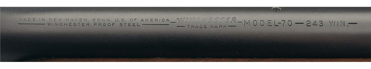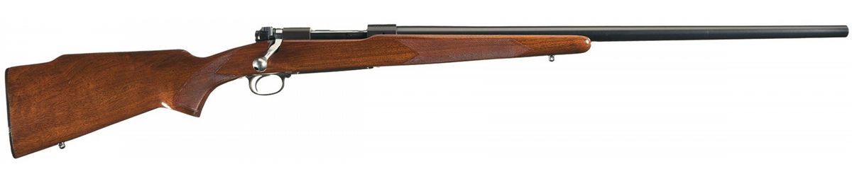 Manufactured in 1959. Standard Winchester markings including the factory proof stamped on the left side of the heavy barrel and receiver at the breech. Barrel and receiver are tapped for sight/scope mounting. Bolt numbered to the gun, straight receiver tang and late type safety. Mounted on a standard type high comb pistol grip stock featuring checkering, sling swivel studs and checkered plastic buttplate.