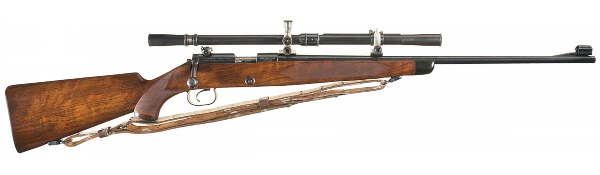 The sporter configuration of the Model 52 rifle was introduced by Winchester in 1934. It went through the same improvements as the Target Rifle. This particular rifle is a very rare and early "Pre-A" Series. It features a hooded ramp front sight, a Lyman receiver sight and a Fecker scope adjustable for windage and elevation. Standard Winchester markings including the factory proof on the left side of the barrel and receiver at the breech and "SPORTING" marked in front of the trigger guard. Jewelled bolt, checkered hollow bolt knob and detachable Winchester magazine. Checkered pistol grip stock with ebony forend cap, hard rubber Winchester grip cap, cheekpiece, checkered steel buttplate and leather sling with quick release sling swivels.