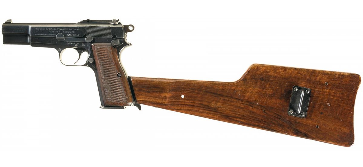 Scarce Pre-War FN High Power Pistol with Matching Number Flat Board Shoulder Stock and Military Leather Holster