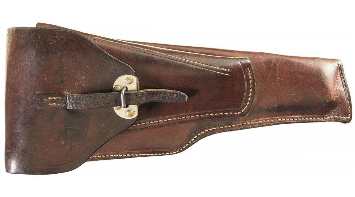 This is a Belgian High Power pistol with the early style flat board shoulder stock and leather stock/pistol holster. The left side of the slide has the standard three line pre-war "FABRIQUE NATIONALE" markings over the various FN factory proofmarks. This model has the tangent rear sight that is graduated from 50-500 meters, with the fixed inverted "V" front sight, that is slotted on the rear grip strap for the walnut shoulder stock. The right side of the barrel, slide and frame have the stacked serial numbers "34707" with the correct FN factory proofmarks on the right side of the chamber. This pistol has the original pre-war flat style walnut board stock that is numbered "34707" on right side with the sling loop on the left side. The stock is drilled with three holes on the side where the original factory leather holster would have originally been attached, while this pistol has the later large combination commercial leather holster that houses both the pistol and the flat board shoulder stock. The holster has a single circled "AC. 39" proof on the front flap. The back of the holster has the large double "D" brass ring, for the shoulder strap (absent). The lot includes one original unnumbered pre-war High Power magazine.