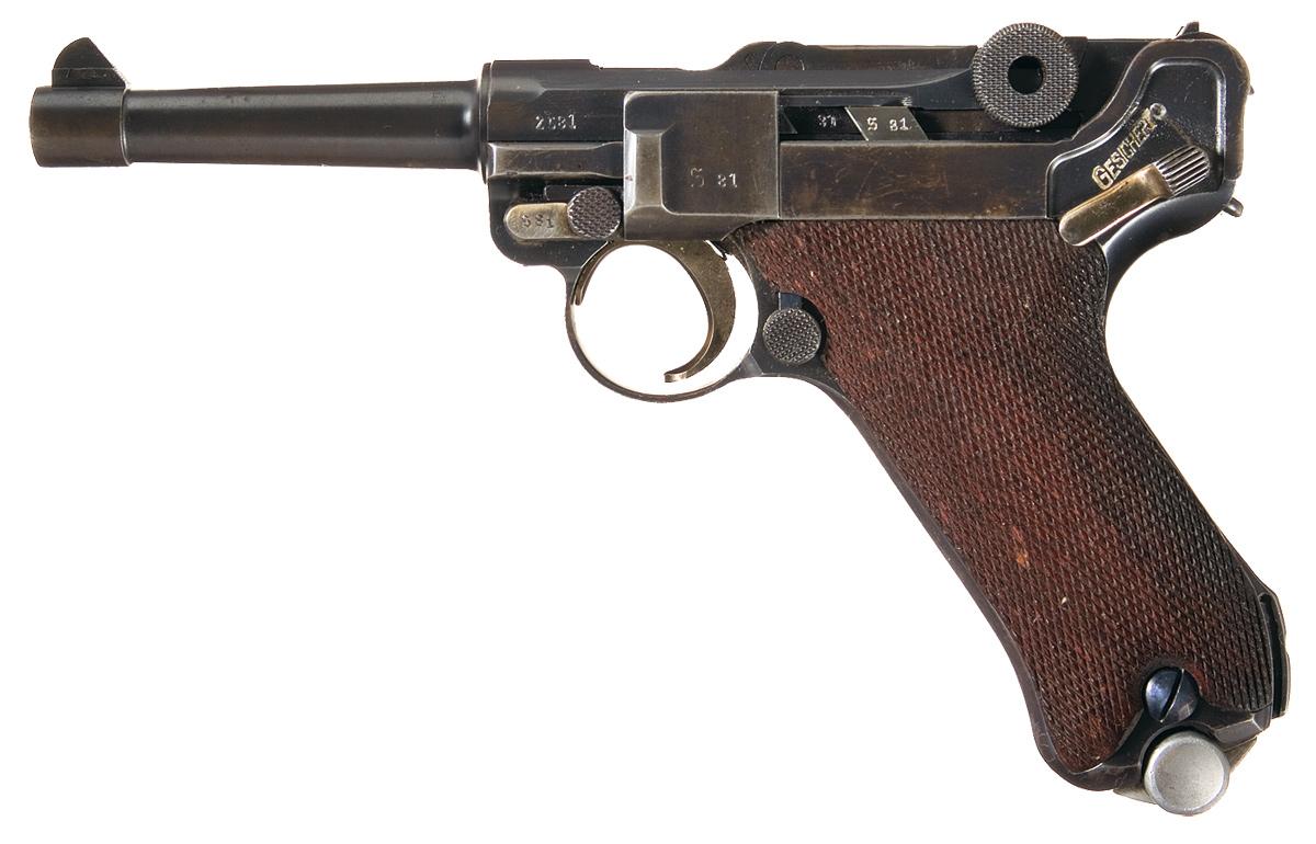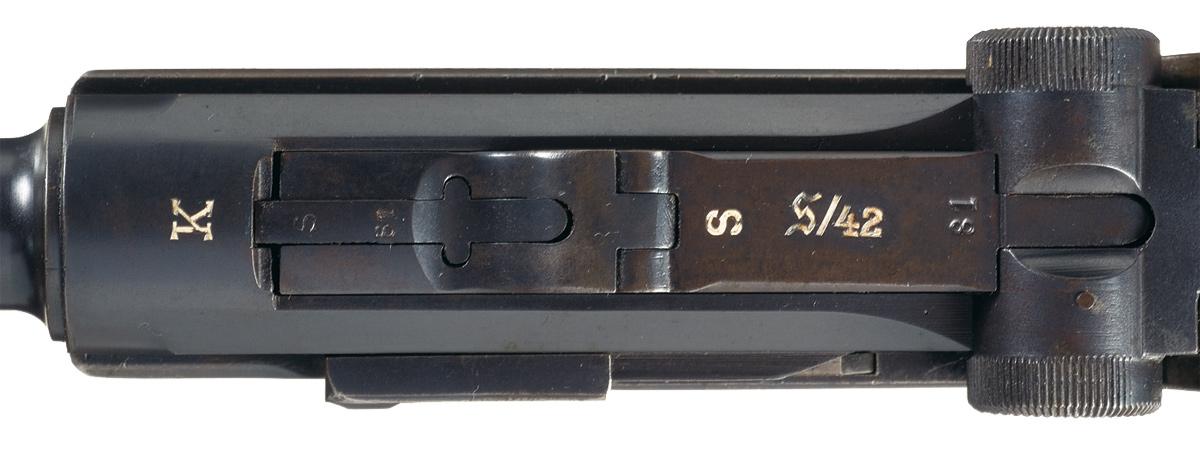 This is a very nice example of the super rare Mauser S/42 "K" Luger pistol, second sub variation, that can be distinguished by having both the Gothic "S" and Script "S" proofmarks on the pistol. There are four distinct sub variations of "K" date lugers for the entire production. With all "K" date Lugers being produced in 1934. In this lot the documented serial numbers run from approximately 1700 to 5250 with this pistol being fairly early in the production cycle. These early production Lugers used letter codes to hide initial rearmament production and the top of the chamber has the distinctive "K" markings indicating that it was produced in 1934, with the top of the rear toggle having both the Gothic "S" and Script "S/42" markings, indicating manufacture at the Mauser factory. The right side of the barrel extension has the single Gothic "S" proofmark over the double "O/37" proofs next to the early drooped wing Mauser Eagle proof, with the same O/37/ Eagle proof markings on each side of the barrel. The underside of the barrel has the serial number and bore diameter. The majority of the small part such as the side plate, extractor, takedown lever, safety, ejector, trigger and magazine release button have the Script "S" proof while the rear toggle, and front of the trigger guard have the Gothic "S" proof. It has walnut checkered grips and is complete with a correct early style nickel plated magazine with an aluminum base that is correctly marked with the "S" proof, serial number 267 and small "O/37" proofmarkings. It has the all rust blued metal finish with the straw colored small parts.