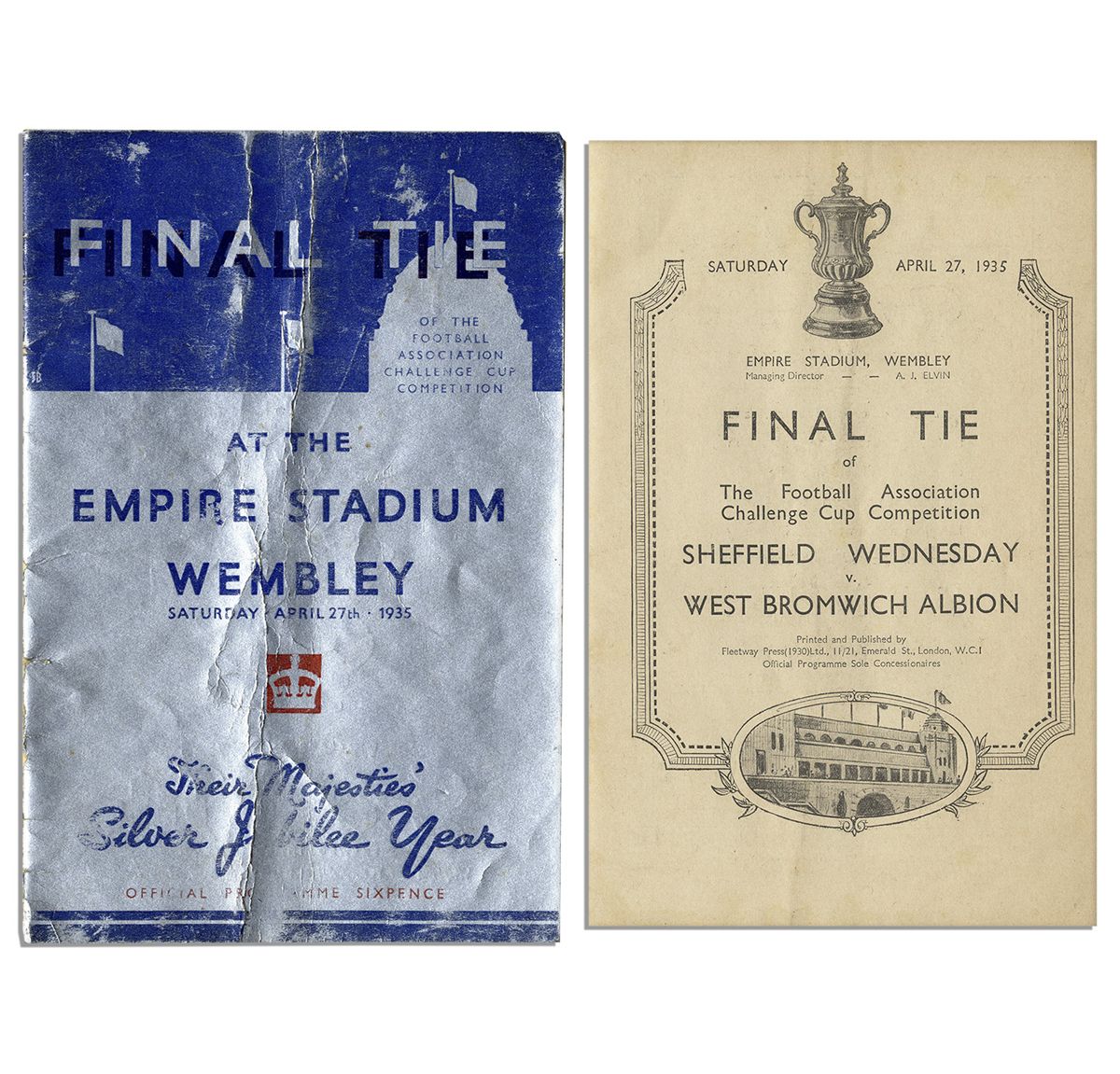 Program from the 1935 Football Association Challenge Cup final game at the Empire Stadium in Wembley. Program for the tie-breaking match between Sheffield Wednesday and West Bromwich Albion features photographs and runs 24pp. Measures 6'' x 9.5''. Toning to leaves and creasing to covers, else near fine.
