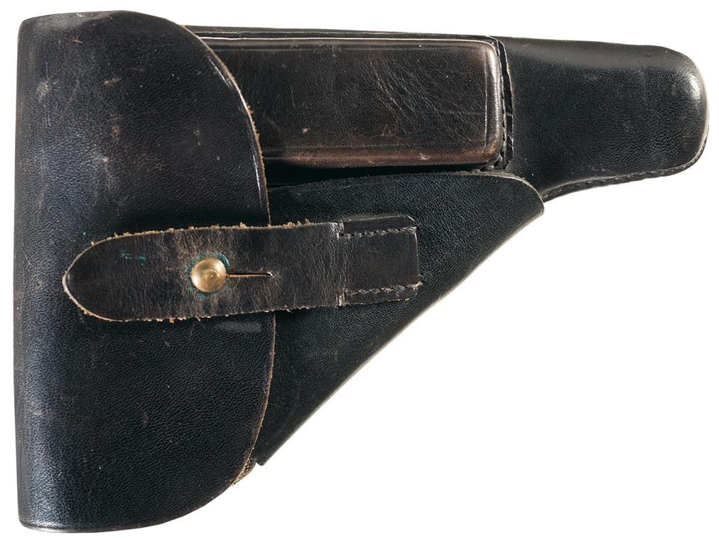 Black leather, double flap construction with an ink stamp "RBD Erfurt Bahnschutz" on the inside of the upper flap and "D.R.G.M." marking on the lower flap. The RBD was the Reichsbahn Deutschland (Railway Service). They used exclusively Walthers for their security and police personnel. They were divided into sections such as Stuttgart, Kassel, etc. A rare unit marked holster.