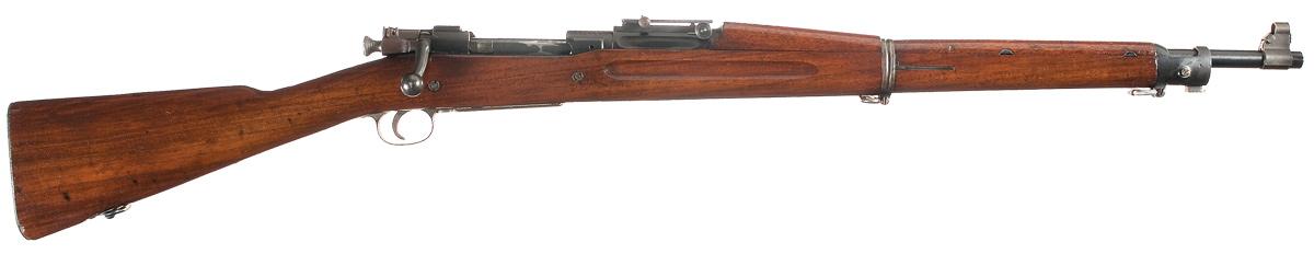 Produced by Sedgely in the 1920s and 1930s, chiefly for Bannerman, by refitting government surplus 1903 receivers. Hooded blade front and folding ladder rear sight, with "C64157-4" on the sight hood, unmarked barrel and standard receiver ring marks. Smooth straight grip stock with dual recoil bolts, "P" behind the trigger guard, sling swivels and a flat buttplate.