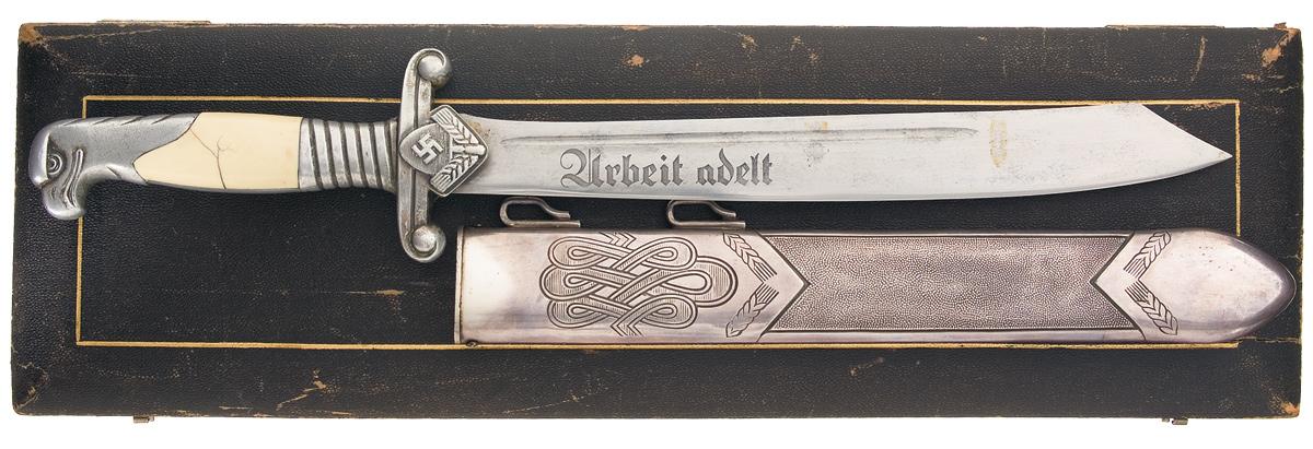 Designed and introduced in 1937. Blade is 10 1/4" long, with thin single fullers, scimitar-like front clip and acid etched "Arbeit adelt" (Work ennobles) slogan on the right side. Aged nickel finished dual quillion cross guard with "spade and grain" RAD logo on the right, smooth imitation ivory grip panels and detailed eagle head pommel. Metal sheath with pebbled center panel bordered by shoots of grain and overlapping scroll designs at the throat. With a green and black velvet lined leatherette case.