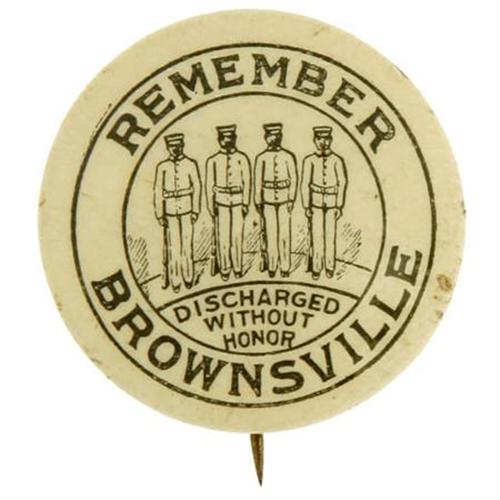 <B>Scarce “Remember Brownsville” Pinback Button,</B></I> 1 ¼”. Following the shooting of a White bartender and policeman near Ft. Brown, Texas, blame was put on Black enlisted men of the 25th U. S. Infantry. On November 9, 1906, by Direction of President Theodore Roosevelt and pursuant to War Department Special Order No. 266, 167 enlisted men of the unit were “discharged without honor”. This was immediate and meant a forfeiture of all rank, retirement, pay and privileges and disqualification from any federal job. Some surface wear, else fine. <BR><BR><b>Shipping:</b> Miscellaneous Collectibles, Smal (<a target="_blank" href="http://www.heritageauctions.com/common/shipping.php">view shipping information</a>)