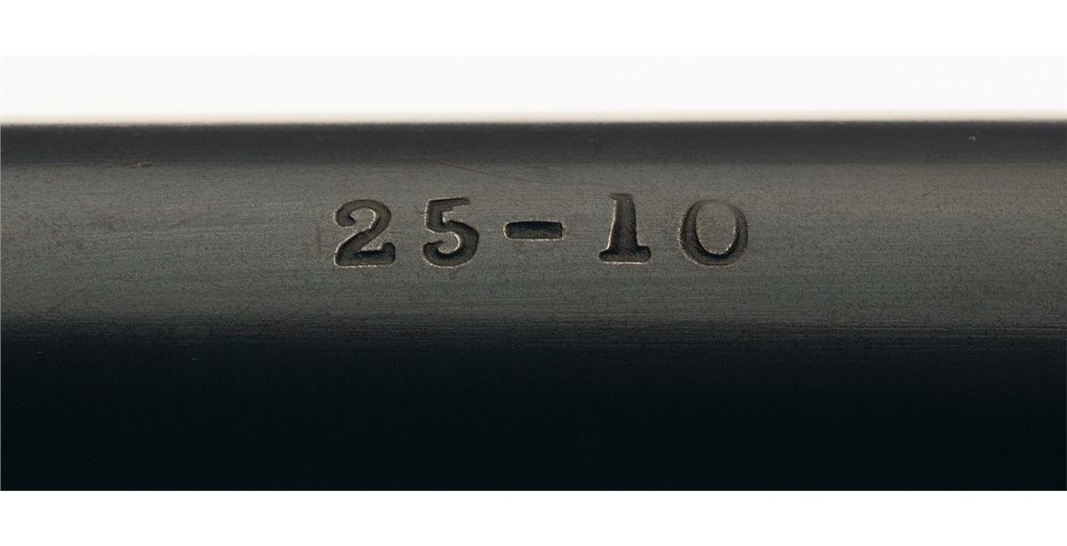 Approximately 1,000 of this model were manufactured between 1903 and 1911. This example has a brass beaded blade front sight and an elevation adjustable rear sight in a dovetail on the barrel. The tang sight is absent. The top of the barrel is marked "REMINGTON ARMS Co. ILION, N.Y.U.S.A.", the bottom of the barrel in front of the forearm is marked "25-10" and under the forearm is the matching serial number "300007". Having a serial number this high could mean that production started at serial number 300,000. Mounted on a multi-point checkered walnut forearm with ebony inlay and a Schnabel tip along with a pistol grip stock with hard rubber grip cap and checkered hard rubber buttplate.